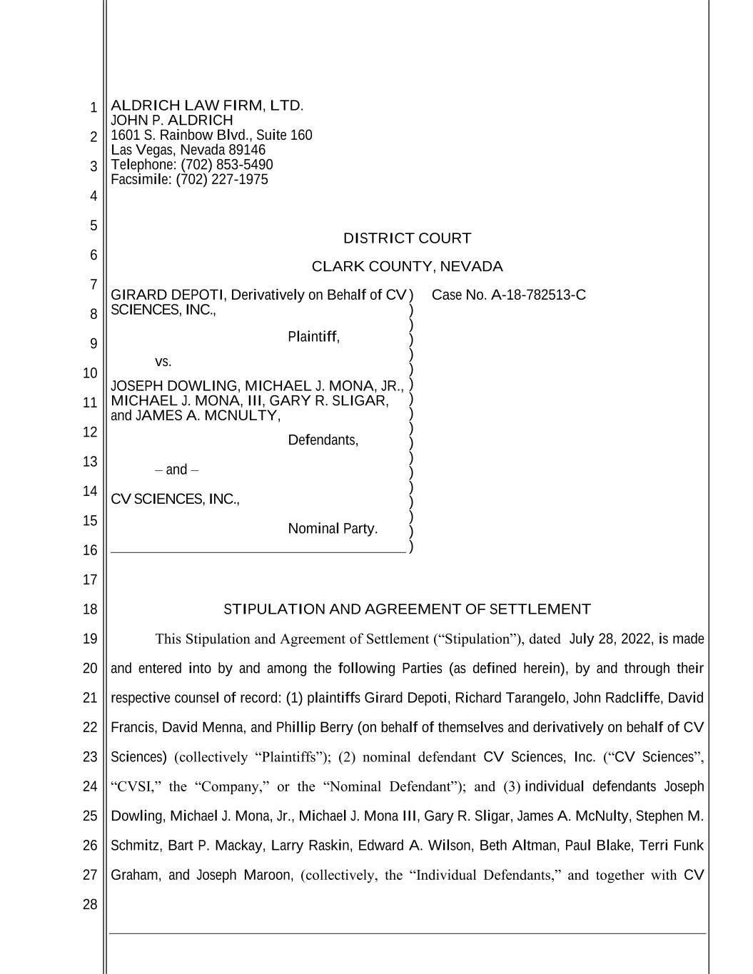 1 2 3 4 5 6 7 8 9 10 11 12 13 14 15 16 17 18 19 20 21 22 23 24 25 26 27 28 ALDRICH LAW FIRM, LTD. JOHN P. ALDRICH 1601 S. Rainbow Blvd., Suite 160 Las Vegas, Nevada 89146 Telephone: (702) 853-5490 Facsimile: (702) 227-1975 DISTRICT COURT CLARK COUNTY, NEVADA GIRARD DEPOTI, Derivatively on Behalf of CV SCIENCES, INC., Plaintiff, vs. JOSEPH DOWLING, MICHAEL J. MONA, JR., MICHAEL J. MONA, III, GARY R. SLIGAR, and JAMES A. MCNULTY, Defendants, – and – CV SCIENCES, INC., Nominal Party. ) ) ) ) ) ) ) ) ) ) ) ) ) ) ) ) ) ) Case No. A-18-782513-C STIPULATION AND AGREEMENT OF SETTLEMENT This Stipulation and Agreement of Settlement (“Stipulation”), dated July 28, 2022, is made and entered into by and among the following Parties (as defined herein), by and through their respective counsel of record: (1) plaintiffs Girard Depoti, Richard Tarangelo, John Radcliffe, David Francis, David Menna, and Phillip Berry (on behalf of themselves and derivatively on behalf of CV Sciences) (collectively “Plaintiffs”); (2) nominal defendant CV Sciences, Inc. (“CV Sciences”, “CVSI,” the “Company,” or the “Nominal Defendant”); and (3) individual defendants Joseph Dowling, Michael J. Mona, Jr., Michael J. Mona III, Gary R. Sligar, James A. McNulty, Stephen M. Schmitz, Bart P. Mackay, Larry Raskin, Edward A. Wilson, Beth Altman, Paul Blake, Terri Funk Graham, and Joseph Maroon, (collectively, the “Individual Defendants,” and together with CV