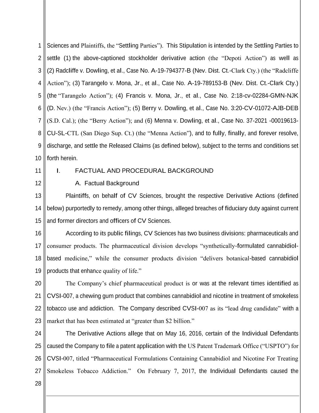 1 2 3 4 5 6 7 8 9 10 11 12 13 14 15 16 17 18 19 20 21 22 23 24 25 26 27 28 Sciences and Plaintiffs, the “Settling Parties”). This Stipulation is intended by the Settling Parties to settle (1) the above-captioned stockholder derivative action (the “Depoti Action”) as well as (2) Radcliffe v. Dowling, et al., Case No. A-19-794377-B (Nev. Dist. Ct.-Clark Cty.) (the “Radcliffe Action”); (3) Tarangelo v. Mona, Jr., et al., Case No. A-19-789153-B (Nev. Dist. Ct.-Clark Cty.) (the “Tarangelo Action”); (4) Francis v. Mona, Jr., et al., Case No. 2:18-cv-02284-GMN-NJK (D. Nev.) (the “Francis Action”); (5) Berry v. Dowling, et al., Case No. 3:20-CV-01072-AJB-DEB (S.D. Cal.); (the “Berry Action”); and (6) Menna v. Dowling, et al., Case No. 37-2021 -00019613- CU-SL-CTL (San Diego Sup. Ct.) (the “Menna Action”), and to fully, finally, and forever resolve, discharge, and settle the Released Claims (as defined below), subject to the terms and conditions set forth herein. I. FACTUAL AND PROCEDURAL BACKGROUND A. Factual Background Plaintiffs, on behalf of CV Sciences, brought the respective Derivative Actions (defined below) purportedly to remedy, among other things, alleged breaches of fiduciary duty against current and former directors and officers of CV Sciences. According to its public filings, CV Sciences has two business divisions: pharmaceuticals and consumer products. The pharmaceutical division develops “synthetically-formulated cannabidiol- based medicine,” while the consumer products division “delivers botanical-based cannabidiol products that enhance quality of life.” The Company’s chief pharmaceutical product is or was at the relevant times identified as CVSI-007, a chewing gum product that combines cannabidiol and nicotine in treatment of smokeless tobacco use and addiction. The Company described CVSI-007 as its “lead drug candidate” with a market that has been estimated at “greater than $2 billion.” The Derivative Actions allege that on May 16, 2016, certain of the Individual Defendants caused the Company to file a patent application with the US Patent Trademark Office (“USPTO”) for CVSI-007, titled “Pharmaceutical Formulations Containing Cannabidiol and Nicotine For Treating Smokeless Tobacco Addiction.” On February 7, 2017, the Individual Defendants caused the