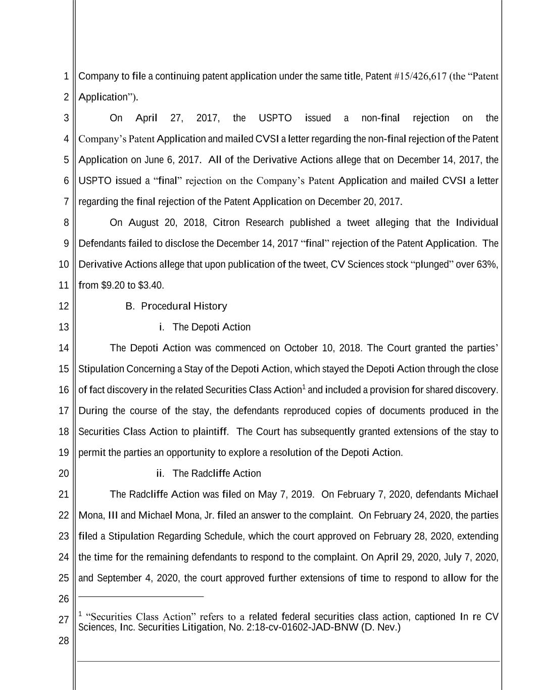 1 2 3 4 5 6 7 8 9 10 11 12 13 14 15 16 17 18 19 20 21 22 23 24 25 26 27 28 Company to file a continuing patent application under the same title, Patent #15/426,617 (the “Patent Application”). On April 27, 2017, the USPTO issued a non-final rejection on the Company’s Patent Application and mailed CVSI a letter regarding the non-final rejection of the Patent Application on June 6, 2017. All of the Derivative Actions allege that on December 14, 2017, the USPTO issued a “final” rejection on the Company’s Patent Application and mailed CVSI a letter regarding the final rejection of the Patent Application on December 20, 2017. On August 20, 2018, Citron Research published a tweet alleging that the Individual Defendants failed to disclose the December 14, 2017 “final” rejection of the Patent Application. The Derivative Actions allege that upon publication of the tweet, CV Sciences stock “plunged” over 63%, from $9.20 to $3.40. B. Procedural History i. The Depoti Action The Depoti Action was commenced on October 10, 2018. The Court granted the parties’ Stipulation Concerning a Stay of the Depoti Action, which stayed the Depoti Action through the close of fact discovery in the related Securities Class Action1 and included a provision for shared discovery. During the course of the stay, the defendants reproduced copies of documents produced in the Securities Class Action to plaintiff. The Court has subsequently granted extensions of the stay to permit the parties an opportunity to explore a resolution of the Depoti Action. ii. The Radcliffe Action The Radcliffe Action was filed on May 7, 2019. On February 7, 2020, defendants Michael Mona, III and Michael Mona, Jr. filed an answer to the complaint. On February 24, 2020, the parties filed a Stipulation Regarding Schedule, which the court approved on February 28, 2020, extending the time for the remaining defendants to respond to the complaint. On April 29, 2020, July 7, 2020, and September 4, 2020, the court approved further extensions of time to respond to allow for the 1 “Securities Class Action” refers to a related federal securities class action, captioned In re CV Sciences, Inc. Securities Litigation, No. 2:18-cv-01602-JAD-BNW (D. Nev.)