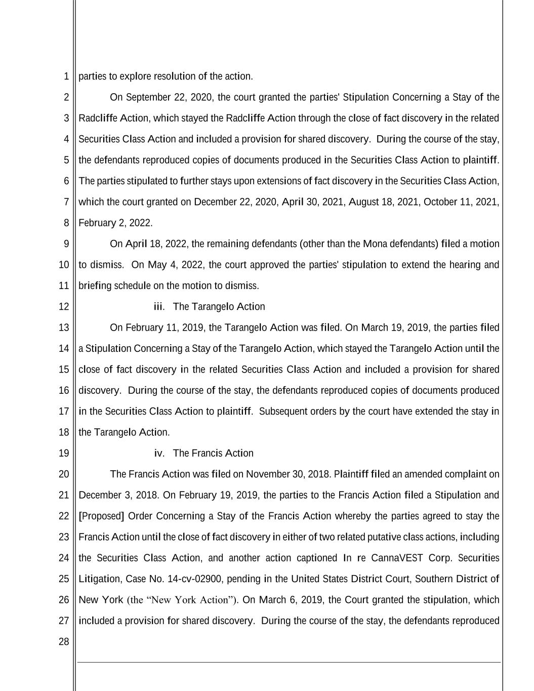 1 2 3 4 5 6 7 8 9 10 11 12 13 14 15 16 17 18 19 20 21 22 23 24 25 26 27 28 parties to explore resolution of the action. On September 22, 2020, the court granted the parties' Stipulation Concerning a Stay of the Radcliffe Action, which stayed the Radcliffe Action through the close of fact discovery in the related Securities Class Action and included a provision for shared discovery. During the course of the stay, the defendants reproduced copies of documents produced in the Securities Class Action to plaintiff. The parties stipulated to further stays upon extensions of fact discovery in the Securities Class Action, which the court granted on December 22, 2020, April 30, 2021, August 18, 2021, October 11, 2021, February 2, 2022. On April 18, 2022, the remaining defendants (other than the Mona defendants) filed a motion to dismiss. On May 4, 2022, the court approved the parties' stipulation to extend the hearing and briefing schedule on the motion to dismiss. iii. The Tarangelo Action On February 11, 2019, the Tarangelo Action was filed. On March 19, 2019, the parties filed a Stipulation Concerning a Stay of the Tarangelo Action, which stayed the Tarangelo Action until the close of fact discovery in the related Securities Class Action and included a provision for shared discovery. During the course of the stay, the defendants reproduced copies of documents produced in the Securities Class Action to plaintiff. Subsequent orders by the court have extended the stay in the Tarangelo Action. iv. The Francis Action The Francis Action was filed on November 30, 2018. Plaintiff filed an amended complaint on December 3, 2018. On February 19, 2019, the parties to the Francis Action filed a Stipulation and [Proposed] Order Concerning a Stay of the Francis Action whereby the parties agreed to stay the Francis Action until the close of fact discovery in either of two related putative class actions, including the Securities Class Action, and another action captioned In re CannaVEST Corp. Securities Litigation, Case No. 14-cv-02900, pending in the United States District Court, Southern District of New York (the “New York Action”). On March 6, 2019, the Court granted the stipulation, which included a provision for shared discovery. During the course of the stay, the defendants reproduced
