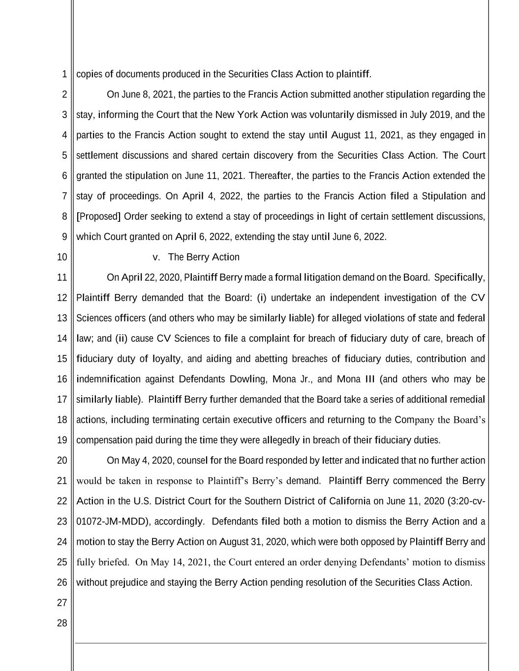 1 2 3 4 5 6 7 8 9 10 11 12 13 14 15 16 17 18 19 20 21 22 23 24 25 26 27 28 copies of documents produced in the Securities Class Action to plaintiff. On June 8, 2021, the parties to the Francis Action submitted another stipulation regarding the stay, informing the Court that the New York Action was voluntarily dismissed in July 2019, and the parties to the Francis Action sought to extend the stay until August 11, 2021, as they engaged in settlement discussions and shared certain discovery from the Securities Class Action. The Court granted the stipulation on June 11, 2021. Thereafter, the parties to the Francis Action extended the stay of proceedings. On April 4, 2022, the parties to the Francis Action filed a Stipulation and [Proposed] Order seeking to extend a stay of proceedings in light of certain settlement discussions, which Court granted on April 6, 2022, extending the stay until June 6, 2022. v. The Berry Action On April 22, 2020, Plaintiff Berry made a formal litigation demand on the Board. Specifically, Plaintiff Berry demanded that the Board: (i) undertake an independent investigation of the CV Sciences officers (and others who may be similarly liable) for alleged violations of state and federal law; and (ii) cause CV Sciences to file a complaint for breach of fiduciary duty of care, breach of fiduciary duty of loyalty, and aiding and abetting breaches of fiduciary duties, contribution and indemnification against Defendants Dowling, Mona Jr., and Mona III (and others who may be similarly liable). Plaintiff Berry further demanded that the Board take a series of additional remedial actions, including terminating certain executive officers and returning to the Company the Board’s compensation paid during the time they were allegedly in breach of their fiduciary duties. On May 4, 2020, counsel for the Board responded by letter and indicated that no further action would be taken in response to Plaintiff’s Berry’s demand. Plaintiff Berry commenced the Berry Action in the U.S. District Court for the Southern District of California on June 11, 2020 (3:20-cv- 01072-JM-MDD), accordingly. Defendants filed both a motion to dismiss the Berry Action and a motion to stay the Berry Action on August 31, 2020, which were both opposed by Plaintiff Berry and fully briefed. On May 14, 2021, the Court entered an order denying Defendants’ motion to dismiss without prejudice and staying the Berry Action pending resolution of the Securities Class Action.