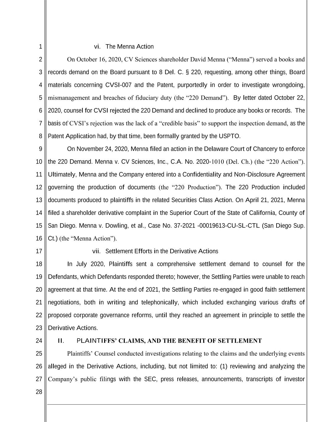 1 2 3 4 5 6 7 8 9 10 11 12 13 14 15 16 17 18 19 20 21 22 23 24 25 26 27 28 vi. The Menna Action On October 16, 2020, CV Sciences shareholder David Menna (“Menna”) served a books and records demand on the Board pursuant to 8 Del. C. § 220, requesting, among other things, Board materials concerning CVSI-007 and the Patent, purportedly in order to investigate wrongdoing, mismanagement and breaches of fiduciary duty (the “220 Demand”). By letter dated October 22, 2020, counsel for CVSI rejected the 220 Demand and declined to produce any books or records. The basis of CVSI’s rejection was the lack of a “credible basis” to support the inspection demand, as the Patent Application had, by that time, been formally granted by the USPTO. On November 24, 2020, Menna filed an action in the Delaware Court of Chancery to enforce the 220 Demand. Menna v. CV Sciences, Inc., C.A. No. 2020-1010 (Del. Ch.) (the “220 Action”). Ultimately, Menna and the Company entered into a Confidentiality and Non-Disclosure Agreement governing the production of documents (the “220 Production”). The 220 Production included documents produced to plaintiffs in the related Securities Class Action. On April 21, 2021, Menna filed a shareholder derivative complaint in the Superior Court of the State of California, County of San Diego. Menna v. Dowling, et al., Case No. 37-2021 -00019613-CU-SL-CTL (San Diego Sup. Ct.) (the “Menna Action”). vii. Settlement Efforts in the Derivative Actions In July 2020, Plaintiffs sent a comprehensive settlement demand to counsel for the Defendants, which Defendants responded thereto; however, the Settling Parties were unable to reach agreement at that time. At the end of 2021, the Settling Parties re-engaged in good faith settlement negotiations, both in writing and telephonically, which included exchanging various drafts of proposed corporate governance reforms, until they reached an agreement in principle to settle the Derivative Actions. II. PLAINTIFFS’ CLAIMS, AND THE BENEFIT OF SETTLEMENT Plaintiffs’ Counsel conducted investigations relating to the claims and the underlying events alleged in the Derivative Actions, including, but not limited to: (1) reviewing and analyzing the Company’s public filings with the SEC, press releases, announcements, transcripts of investor