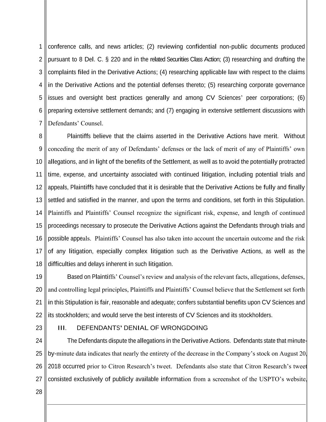 1 2 3 4 5 6 7 8 9 10 11 12 13 14 15 16 17 18 19 20 21 22 23 24 25 26 27 28 conference calls, and news articles; (2) reviewing confidential non-public documents produced pursuant to 8 Del. C. § 220 and in the related Securities Class Action; (3) researching and drafting the complaints filed in the Derivative Actions; (4) researching applicable law with respect to the claims in the Derivative Actions and the potential defenses thereto; (5) researching corporate governance issues and oversight best practices generally and among CV Sciences’ peer corporations; (6) preparing extensive settlement demands; and (7) engaging in extensive settlement discussions with Defendants’ Counsel. Plaintiffs believe that the claims asserted in the Derivative Actions have merit. Without conceding the merit of any of Defendants’ defenses or the lack of merit of any of Plaintiffs’ own allegations, and in light of the benefits of the Settlement, as well as to avoid the potentially protracted time, expense, and uncertainty associated with continued litigation, including potential trials and appeals, Plaintiffs have concluded that it is desirable that the Derivative Actions be fully and finally settled and satisfied in the manner, and upon the terms and conditions, set forth in this Stipulation. Plaintiffs and Plaintiffs’ Counsel recognize the significant risk, expense, and length of continued proceedings necessary to prosecute the Derivative Actions against the Defendants through trials and possible appeals. Plaintiffs’ Counsel has also taken into account the uncertain outcome and the risk of any litigation, especially complex litigation such as the Derivative Actions, as well as the difficulties and delays inherent in such litigation. Based on Plaintiffs’ Counsel’s review and analysis of the relevant facts, allegations, defenses, and controlling legal principles, Plaintiffs and Plaintiffs’ Counsel believe that the Settlement set forth in this Stipulation is fair, reasonable and adequate; confers substantial benefits upon CV Sciences and its stockholders; and would serve the best interests of CV Sciences and its stockholders. III. DEFENDANTS’ DENIAL OF WRONGDOING The Defendants dispute the allegations in the Derivative Actions. Defendants state that minute- by-minute data indicates that nearly the entirety of the decrease in the Company’s stock on August 20, 2018 occurred prior to Citron Research’s tweet. Defendants also state that Citron Research’s tweet consisted exclusively of publicly available information from a screenshot of the USPTO’s website,