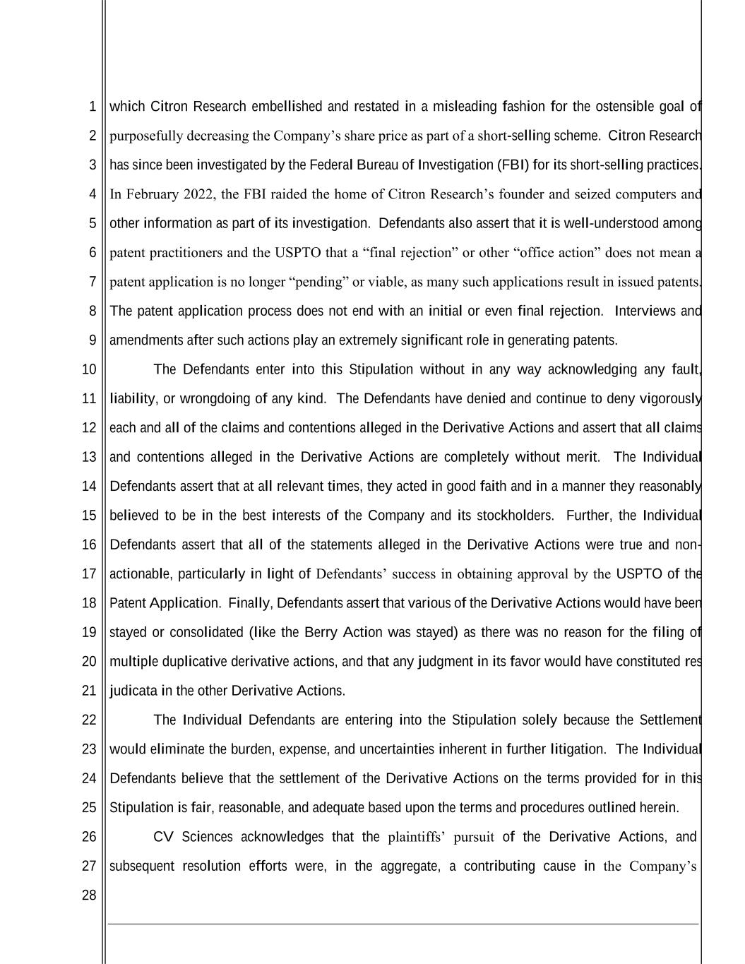 1 2 3 4 5 6 7 8 9 10 11 12 13 14 15 16 17 18 19 20 21 22 23 24 25 26 27 28 which Citron Research embellished and restated in a misleading fashion for the ostensible goal of purposefully decreasing the Company’s share price as part of a short-selling scheme. Citron Research has since been investigated by the Federal Bureau of Investigation (FBI) for its short-selling practices. In February 2022, the FBI raided the home of Citron Research’s founder and seized computers and other information as part of its investigation. Defendants also assert that it is well-understood among patent practitioners and the USPTO that a “final rejection” or other “office action” does not mean a patent application is no longer “pending” or viable, as many such applications result in issued patents. The patent application process does not end with an initial or even final rejection. Interviews and amendments after such actions play an extremely significant role in generating patents. The Defendants enter into this Stipulation without in any way acknowledging any fault, liability, or wrongdoing of any kind. The Defendants have denied and continue to deny vigorously each and all of the claims and contentions alleged in the Derivative Actions and assert that all claims and contentions alleged in the Derivative Actions are completely without merit. The Individual Defendants assert that at all relevant times, they acted in good faith and in a manner they reasonably believed to be in the best interests of the Company and its stockholders. Further, the Individual Defendants assert that all of the statements alleged in the Derivative Actions were true and non- actionable, particularly in light of Defendants’ success in obtaining approval by the USPTO of the Patent Application. Finally, Defendants assert that various of the Derivative Actions would have been stayed or consolidated (like the Berry Action was stayed) as there was no reason for the filing of multiple duplicative derivative actions, and that any judgment in its favor would have constituted res judicata in the other Derivative Actions. The Individual Defendants are entering into the Stipulation solely because the Settlement would eliminate the burden, expense, and uncertainties inherent in further litigation. The Individual Defendants believe that the settlement of the Derivative Actions on the terms provided for in this Stipulation is fair, reasonable, and adequate based upon the terms and procedures outlined herein. CV Sciences acknowledges that the plaintiffs’ pursuit of the Derivative Actions, and subsequent resolution efforts were, in the aggregate, a contributing cause in the Company’s