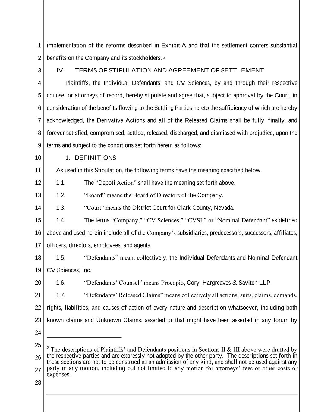 1 2 3 4 5 6 7 8 9 10 11 12 13 14 15 16 17 18 19 20 21 22 23 24 25 26 27 28 implementation of the reforms described in Exhibit A and that the settlement confers substantial benefits on the Company and its stockholders. 2 IV. TERMS OF STIPULATION AND AGREEMENT OF SETTLEMENT Plaintiffs, the Individual Defendants, and CV Sciences, by and through their respective counsel or attorneys of record, hereby stipulate and agree that, subject to approval by the Court, in consideration of the benefits flowing to the Settling Parties hereto the sufficiency of which are hereby acknowledged, the Derivative Actions and all of the Released Claims shall be fully, finally, and forever satisfied, compromised, settled, released, discharged, and dismissed with prejudice, upon the terms and subject to the conditions set forth herein as follows: 1. DEFINITIONS As used in this Stipulation, the following terms have the meaning specified below. 1.1. The “Depoti Action” shall have the meaning set forth above. 1.2. “Board” means the Board of Directors of the Company. 1.3. “Court” means the District Court for Clark County, Nevada. 1.4. The terms “Company,” “CV Sciences,” “CVSI,” or “Nominal Defendant” as defined above and used herein include all of the Company’s subsidiaries, predecessors, successors, affiliates, officers, directors, employees, and agents. 1.5. “Defendants” mean, collectively, the Individual Defendants and Nominal Defendant CV Sciences, Inc. 1.6. “Defendants’ Counsel” means Procopio, Cory, Hargreaves & Savitch LLP. 1.7. “Defendants’ Released Claims” means collectively all actions, suits, claims, demands, rights, liabilities, and causes of action of every nature and description whatsoever, including both known claims and Unknown Claims, asserted or that might have been asserted in any forum by 2 The descriptions of Plaintiffs’ and Defendants positions in Sections II & III above were drafted by the respective parties and are expressly not adopted by the other party. The descriptions set forth in these sections are not to be construed as an admission of any kind, and shall not be used against any party in any motion, including but not limited to any motion for attorneys’ fees or other costs or expenses.