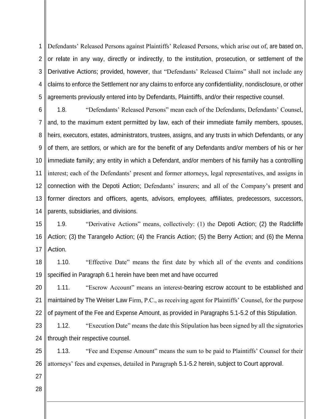 1 2 3 4 5 6 7 8 9 10 11 12 13 14 15 16 17 18 19 20 21 22 23 24 25 26 27 28 Defendants’ Released Persons against Plaintiffs’ Released Persons, which arise out of, are based on, or relate in any way, directly or indirectly, to the institution, prosecution, or settlement of the Derivative Actions; provided, however, that “Defendants’ Released Claims” shall not include any claims to enforce the Settlement nor any claims to enforce any confidentiality, nondisclosure, or other agreements previously entered into by Defendants, Plaintiffs, and/or their respective counsel. 1.8. “Defendants’ Released Persons” mean each of the Defendants, Defendants’ Counsel, and, to the maximum extent permitted by law, each of their immediate family members, spouses, heirs, executors, estates, administrators, trustees, assigns, and any trusts in which Defendants, or any of them, are settlors, or which are for the benefit of any Defendants and/or members of his or her immediate family; any entity in which a Defendant, and/or members of his family has a controlling interest; each of the Defendants’ present and former attorneys, legal representatives, and assigns in connection with the Depoti Action; Defendants’ insurers; and all of the Company’s present and former directors and officers, agents, advisors, employees, affiliates, predecessors, successors, parents, subsidiaries, and divisions. 1.9. “Derivative Actions” means, collectively: (1) the Depoti Action; (2) the Radcliffe Action; (3) the Tarangelo Action; (4) the Francis Action; (5) the Berry Action; and (6) the Menna Action. 1.10. “Effective Date” means the first date by which all of the events and conditions specified in Paragraph 6.1 herein have been met and have occurred 1.11. “Escrow Account” means an interest-bearing escrow account to be established and maintained by The Weiser Law Firm, P.C., as receiving agent for Plaintiffs’ Counsel, for the purpose of payment of the Fee and Expense Amount, as provided in Paragraphs 5.1-5.2 of this Stipulation. 1.12. “Execution Date” means the date this Stipulation has been signed by all the signatories through their respective counsel. 1.13. “Fee and Expense Amount” means the sum to be paid to Plaintiffs’ Counsel for their attorneys’ fees and expenses, detailed in Paragraph 5.1-5.2 herein, subject to Court approval.
