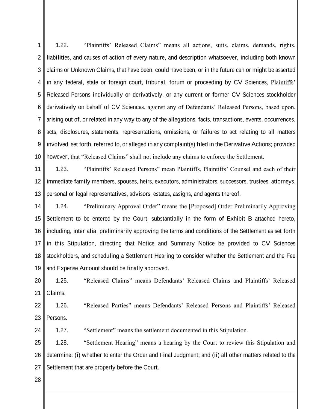 1 2 3 4 5 6 7 8 9 10 11 12 13 14 15 16 17 18 19 20 21 22 23 24 25 26 27 28 1.22. “Plaintiffs’ Released Claims” means all actions, suits, claims, demands, rights, liabilities, and causes of action of every nature, and description whatsoever, including both known claims or Unknown Claims, that have been, could have been, or in the future can or might be asserted in any federal, state or foreign court, tribunal, forum or proceeding by CV Sciences, Plaintiffs’ Released Persons individually or derivatively, or any current or former CV Sciences stockholder derivatively on behalf of CV Sciences, against any of Defendants’ Released Persons, based upon, arising out of, or related in any way to any of the allegations, facts, transactions, events, occurrences, acts, disclosures, statements, representations, omissions, or failures to act relating to all matters involved, set forth, referred to, or alleged in any complaint(s) filed in the Derivative Actions; provided however, that “Released Claims” shall not include any claims to enforce the Settlement. 1.23. “Plaintiffs’ Released Persons” mean Plaintiffs, Plaintiffs’ Counsel and each of their immediate family members, spouses, heirs, executors, administrators, successors, trustees, attorneys, personal or legal representatives, advisors, estates, assigns, and agents thereof. 1.24. “Preliminary Approval Order” means the [Proposed] Order Preliminarily Approving Settlement to be entered by the Court, substantially in the form of Exhibit B attached hereto, including, inter alia, preliminarily approving the terms and conditions of the Settlement as set forth in this Stipulation, directing that Notice and Summary Notice be provided to CV Sciences stockholders, and scheduling a Settlement Hearing to consider whether the Settlement and the Fee and Expense Amount should be finally approved. 1.25. “Released Claims” means Defendants’ Released Claims and Plaintiffs’ Released Claims. 1.26. “Released Parties” means Defendants’ Released Persons and Plaintiffs’ Released Persons. 1.27. “Settlement” means the settlement documented in this Stipulation. 1.28. “Settlement Hearing” means a hearing by the Court to review this Stipulation and determine: (i) whether to enter the Order and Final Judgment; and (ii) all other matters related to the Settlement that are properly before the Court.
