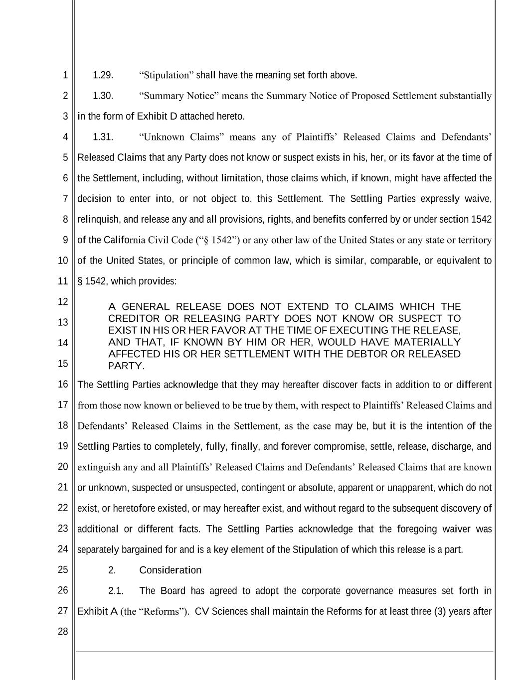 1 2 3 4 5 6 7 8 9 10 11 12 13 14 15 16 17 18 19 20 21 22 23 24 25 26 27 28 1.29. “Stipulation” shall have the meaning set forth above. 1.30. “Summary Notice” means the Summary Notice of Proposed Settlement substantially in the form of Exhibit D attached hereto. 1.31. “Unknown Claims” means any of Plaintiffs’ Released Claims and Defendants’ Released Claims that any Party does not know or suspect exists in his, her, or its favor at the time of the Settlement, including, without limitation, those claims which, if known, might have affected the decision to enter into, or not object to, this Settlement. The Settling Parties expressly waive, relinquish, and release any and all provisions, rights, and benefits conferred by or under section 1542 of the California Civil Code (“§ 1542”) or any other law of the United States or any state or territory of the United States, or principle of common law, which is similar, comparable, or equivalent to § 1542, which provides: A GENERAL RELEASE DOES NOT EXTEND TO CLAIMS WHICH THE CREDITOR OR RELEASING PARTY DOES NOT KNOW OR SUSPECT TO EXIST IN HIS OR HER FAVOR AT THE TIME OF EXECUTING THE RELEASE, AND THAT, IF KNOWN BY HIM OR HER, WOULD HAVE MATERIALLY AFFECTED HIS OR HER SETTLEMENT WITH THE DEBTOR OR RELEASED PARTY. The Settling Parties acknowledge that they may hereafter discover facts in addition to or different from those now known or believed to be true by them, with respect to Plaintiffs’ Released Claims and Defendants’ Released Claims in the Settlement, as the case may be, but it is the intention of the Settling Parties to completely, fully, finally, and forever compromise, settle, release, discharge, and extinguish any and all Plaintiffs’ Released Claims and Defendants’ Released Claims that are known or unknown, suspected or unsuspected, contingent or absolute, apparent or unapparent, which do not exist, or heretofore existed, or may hereafter exist, and without regard to the subsequent discovery of additional or different facts. The Settling Parties acknowledge that the foregoing waiver was separately bargained for and is a key element of the Stipulation of which this release is a part. 2. Consideration 2.1. The Board has agreed to adopt the corporate governance measures set forth in Exhibit A (the “Reforms”). CV Sciences shall maintain the Reforms for at least three (3) years after