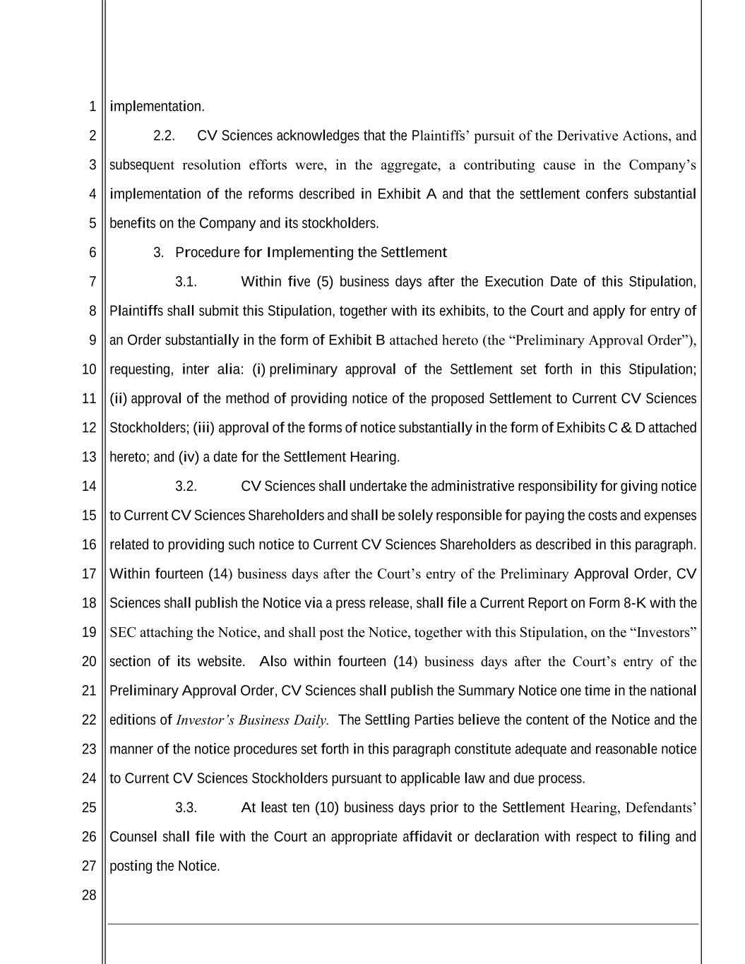 1 2 3 4 5 6 7 8 9 10 11 12 13 14 15 16 17 18 19 20 21 22 23 24 25 26 27 28 implementation. 2.2. CV Sciences acknowledges that the Plaintiffs’ pursuit of the Derivative Actions, and subsequent resolution efforts were, in the aggregate, a contributing cause in the Company’s implementation of the reforms described in Exhibit A and that the settlement confers substantial benefits on the Company and its stockholders. 3. Procedure for Implementing the Settlement 3.1. Within five (5) business days after the Execution Date of this Stipulation, Plaintiffs shall submit this Stipulation, together with its exhibits, to the Court and apply for entry of an Order substantially in the form of Exhibit B attached hereto (the “Preliminary Approval Order”), requesting, inter alia: (i) preliminary approval of the Settlement set forth in this Stipulation; (ii) approval of the method of providing notice of the proposed Settlement to Current CV Sciences Stockholders; (iii) approval of the forms of notice substantially in the form of Exhibits C & D attached hereto; and (iv) a date for the Settlement Hearing. 3.2. CV Sciences shall undertake the administrative responsibility for giving notice to Current CV Sciences Shareholders and shall be solely responsible for paying the costs and expenses related to providing such notice to Current CV Sciences Shareholders as described in this paragraph. Within fourteen (14) business days after the Court’s entry of the Preliminary Approval Order, CV Sciences shall publish the Notice via a press release, shall file a Current Report on Form 8-K with the SEC attaching the Notice, and shall post the Notice, together with this Stipulation, on the “Investors” section of its website. Also within fourteen (14) business days after the Court’s entry of the Preliminary Approval Order, CV Sciences shall publish the Summary Notice one time in the national editions of Investor’s Business Daily. The Settling Parties believe the content of the Notice and the manner of the notice procedures set forth in this paragraph constitute adequate and reasonable notice to Current CV Sciences Stockholders pursuant to applicable law and due process. 3.3. At least ten (10) business days prior to the Settlement Hearing, Defendants’ Counsel shall file with the Court an appropriate affidavit or declaration with respect to filing and posting the Notice.