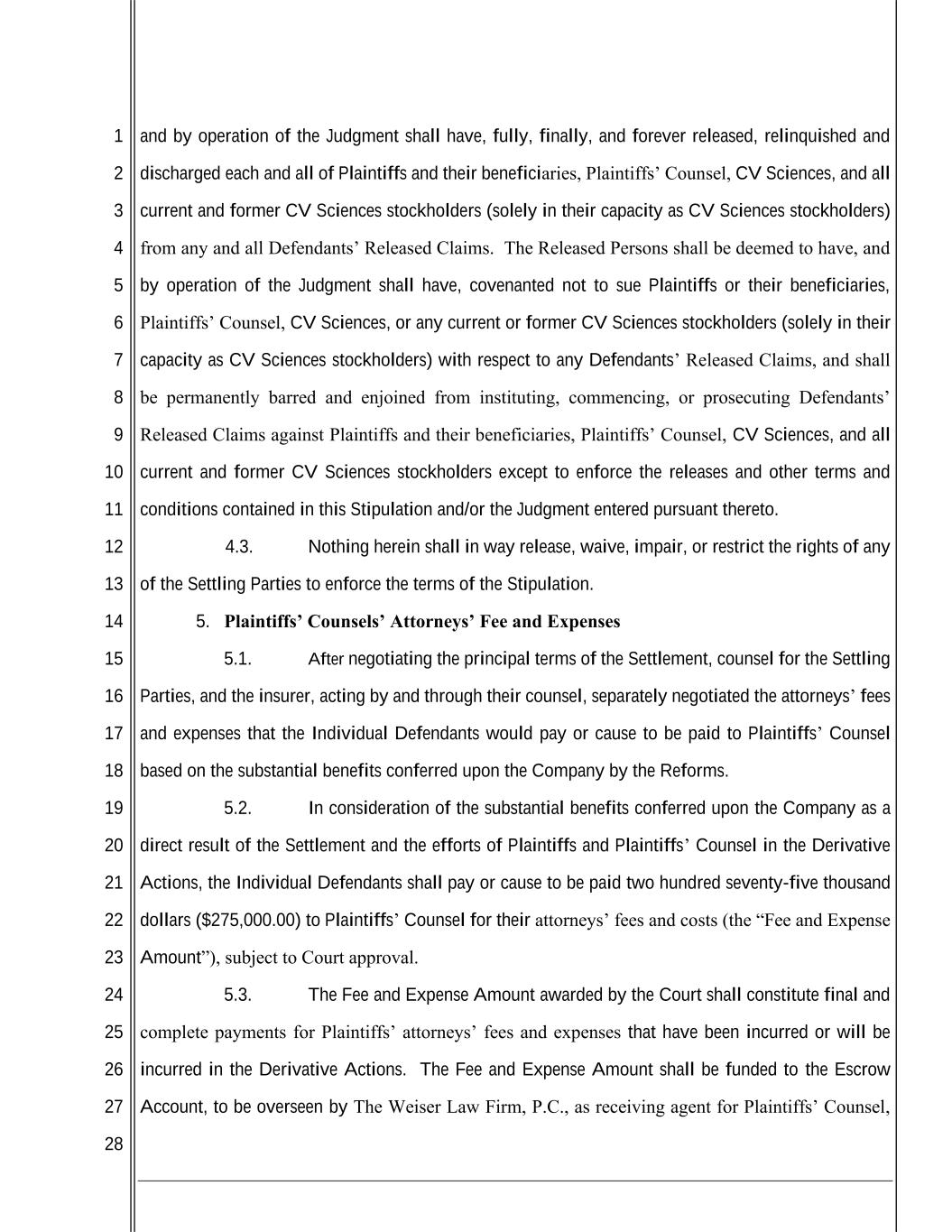 1 2 3 4 5 6 7 8 9 10 11 12 13 14 15 16 17 18 19 20 21 22 23 24 25 26 27 28 and by operation of the Judgment shall have, fully, finally, and forever released, relinquished and discharged each and all of Plaintiffs and their beneficiaries, Plaintiffs’ Counsel, CV Sciences, and all current and former CV Sciences stockholders (solely in their capacity as CV Sciences stockholders) from any and all Defendants’ Released Claims. The Released Persons shall be deemed to have, and by operation of the Judgment shall have, covenanted not to sue Plaintiffs or their beneficiaries, Plaintiffs’ Counsel, CV Sciences, or any current or former CV Sciences stockholders (solely in their capacity as CV Sciences stockholders) with respect to any Defendants’ Released Claims, and shall be permanently barred and enjoined from instituting, commencing, or prosecuting Defendants’ Released Claims against Plaintiffs and their beneficiaries, Plaintiffs’ Counsel, CV Sciences, and all current and former CV Sciences stockholders except to enforce the releases and other terms and conditions contained in this Stipulation and/or the Judgment entered pursuant thereto. 4.3. Nothing herein shall in way release, waive, impair, or restrict the rights of any of the Settling Parties to enforce the terms of the Stipulation. 5. Plaintiffs’ Counsels’ Attorneys’ Fee and Expenses 5.1. After negotiating the principal terms of the Settlement, counsel for the Settling Parties, and the insurer, acting by and through their counsel, separately negotiated the attorneys’ fees and expenses that the Individual Defendants would pay or cause to be paid to Plaintiffs’ Counsel based on the substantial benefits conferred upon the Company by the Reforms. 5.2. In consideration of the substantial benefits conferred upon the Company as a direct result of the Settlement and the efforts of Plaintiffs and Plaintiffs’ Counsel in the Derivative Actions, the Individual Defendants shall pay or cause to be paid two hundred seventy-five thousand dollars ($275,000.00) to Plaintiffs’ Counsel for their attorneys’ fees and costs (the “Fee and Expense Amount”), subject to Court approval. 5.3. The Fee and Expense Amount awarded by the Court shall constitute final and complete payments for Plaintiffs’ attorneys’ fees and expenses that have been incurred or will be incurred in the Derivative Actions. The Fee and Expense Amount shall be funded to the Escrow Account, to be overseen by The Weiser Law Firm, P.C., as receiving agent for Plaintiffs’ Counsel,
