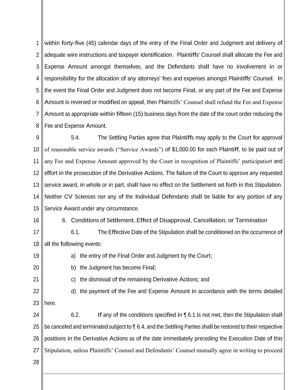 1 2 3 4 5 6 7 8 9 10 11 12 13 14 15 16 17 18 19 20 21 22 23 24 25 26 27 28 within forty-five (45) calendar days of the entry of the Final Order and Judgment and delivery of adequate wire instructions and taxpayer identification. Plaintiffs' Counsel shall allocate the Fee and Expense Amount amongst themselves, and the Defendants shall have no involvement in or responsibility for the allocation of any attorneys' fees and expenses amongst Plaintiffs' Counsel. In the event the Final Order and Judgment does not become Final, or any part of the Fee and Expense Amount is reversed or modified on appeal, then Plaintiffs’ Counsel shall refund the Fee and Expense Amount as appropriate within fifteen (15) business days from the date of the court order reducing the Fee and Expense Amount. 5.4. The Settling Parties agree that Plaintiffs may apply to the Court for approval of reasonable service awards (“Service Awards”) of $1,000.00 for each Plaintiff, to be paid out of any Fee and Expense Amount approved by the Court in recognition of Plaintiffs’ participation and effort in the prosecution of the Derivative Actions. The failure of the Court to approve any requested service award, in whole or in part, shall have no effect on the Settlement set forth in this Stipulation. Neither CV Sciences nor any of the Individual Defendants shall be liable for any portion of any Service Award under any circumstance. 6. Conditions of Settlement, Effect of Disapproval, Cancellation, or Termination 6.1. The Effective Date of the Stipulation shall be conditioned on the occurrence of all the following events: a) the entry of the Final Order and Judgment by the Court; b) the Judgment has become Final; c) the dismissal of the remaining Derivative Actions; and d) the payment of the Fee and Expense Amount in accordance with the terms detailed here. 6.2. If any of the conditions specified in ¶ 6.1 is not met, then the Stipulation shall be canceled and terminated subject to ¶ 6.4, and the Settling Parties shall be restored to their respective positions in the Derivative Actions as of the date immediately preceding the Execution Date of this Stipulation, unless Plaintiffs’ Counsel and Defendants’ Counsel mutually agree in writing to proceed