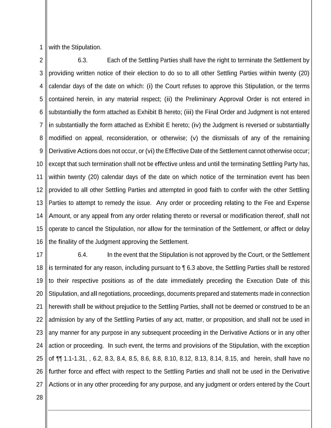 1 2 3 4 5 6 7 8 9 10 11 12 13 14 15 16 17 18 19 20 21 22 23 24 25 26 27 28 with the Stipulation. 6.3. Each of the Settling Parties shall have the right to terminate the Settlement by providing written notice of their election to do so to all other Settling Parties within twenty (20) calendar days of the date on which: (i) the Court refuses to approve this Stipulation, or the terms contained herein, in any material respect; (ii) the Preliminary Approval Order is not entered in substantially the form attached as Exhibit B hereto; (iii) the Final Order and Judgment is not entered in substantially the form attached as Exhibit E hereto; (iv) the Judgment is reversed or substantially modified on appeal, reconsideration, or otherwise; (v) the dismissals of any of the remaining Derivative Actions does not occur, or (vi) the Effective Date of the Settlement cannot otherwise occur; except that such termination shall not be effective unless and until the terminating Settling Party has, within twenty (20) calendar days of the date on which notice of the termination event has been provided to all other Settling Parties and attempted in good faith to confer with the other Settling Parties to attempt to remedy the issue. Any order or proceeding relating to the Fee and Expense Amount, or any appeal from any order relating thereto or reversal or modification thereof, shall not operate to cancel the Stipulation, nor allow for the termination of the Settlement, or affect or delay the finality of the Judgment approving the Settlement. 6.4. In the event that the Stipulation is not approved by the Court, or the Settlement is terminated for any reason, including pursuant to ¶ 6.3 above, the Settling Parties shall be restored to their respective positions as of the date immediately preceding the Execution Date of this Stipulation, and all negotiations, proceedings, documents prepared and statements made in connection herewith shall be without prejudice to the Settling Parties, shall not be deemed or construed to be an admission by any of the Settling Parties of any act, matter, or proposition, and shall not be used in any manner for any purpose in any subsequent proceeding in the Derivative Actions or in any other action or proceeding. In such event, the terms and provisions of the Stipulation, with the exception of ¶¶ 1.1-1.31, , 6.2, 8.3, 8.4, 8.5, 8.6, 8.8, 8.10, 8.12, 8.13, 8.14, 8.15, and herein, shall have no further force and effect with respect to the Settling Parties and shall not be used in the Derivative Actions or in any other proceeding for any purpose, and any judgment or orders entered by the Court