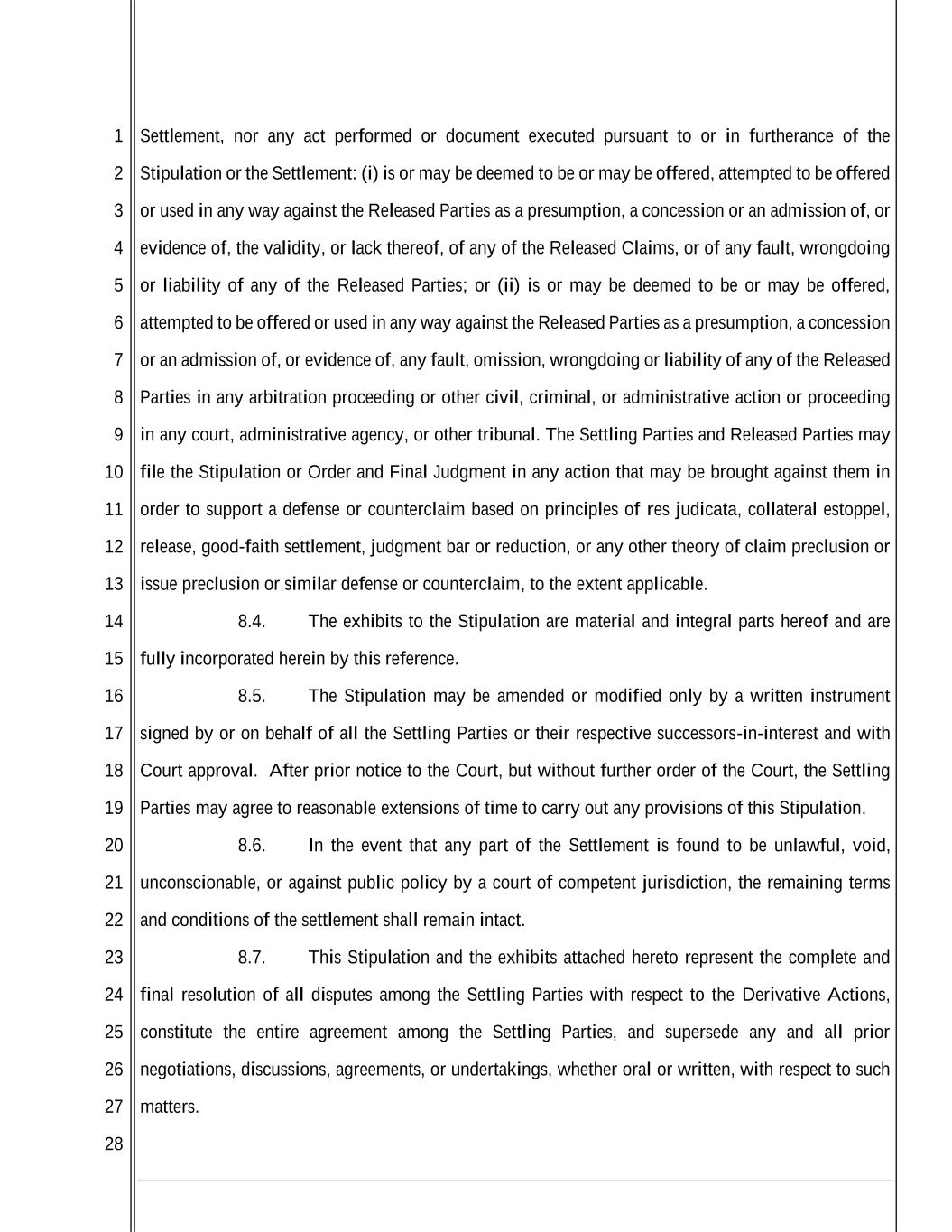 1 2 3 4 5 6 7 8 9 10 11 12 13 14 15 16 17 18 19 20 21 22 23 24 25 26 27 28 Settlement, nor any act performed or document executed pursuant to or in furtherance of the Stipulation or the Settlement: (i) is or may be deemed to be or may be offered, attempted to be offered or used in any way against the Released Parties as a presumption, a concession or an admission of, or evidence of, the validity, or lack thereof, of any of the Released Claims, or of any fault, wrongdoing or liability of any of the Released Parties; or (ii) is or may be deemed to be or may be offered, attempted to be offered or used in any way against the Released Parties as a presumption, a concession or an admission of, or evidence of, any fault, omission, wrongdoing or liability of any of the Released Parties in any arbitration proceeding or other civil, criminal, or administrative action or proceeding in any court, administrative agency, or other tribunal. The Settling Parties and Released Parties may file the Stipulation or Order and Final Judgment in any action that may be brought against them in order to support a defense or counterclaim based on principles of res judicata, collateral estoppel, release, good-faith settlement, judgment bar or reduction, or any other theory of claim preclusion or issue preclusion or similar defense or counterclaim, to the extent applicable. 8.4. The exhibits to the Stipulation are material and integral parts hereof and are fully incorporated herein by this reference. 8.5. The Stipulation may be amended or modified only by a written instrument signed by or on behalf of all the Settling Parties or their respective successors-in-interest and with Court approval. After prior notice to the Court, but without further order of the Court, the Settling Parties may agree to reasonable extensions of time to carry out any provisions of this Stipulation. 8.6. In the event that any part of the Settlement is found to be unlawful, void, unconscionable, or against public policy by a court of competent jurisdiction, the remaining terms and conditions of the settlement shall remain intact. 8.7. This Stipulation and the exhibits attached hereto represent the complete and final resolution of all disputes among the Settling Parties with respect to the Derivative Actions, constitute the entire agreement among the Settling Parties, and supersede any and all prior negotiations, discussions, agreements, or undertakings, whether oral or written, with respect to such matters.
