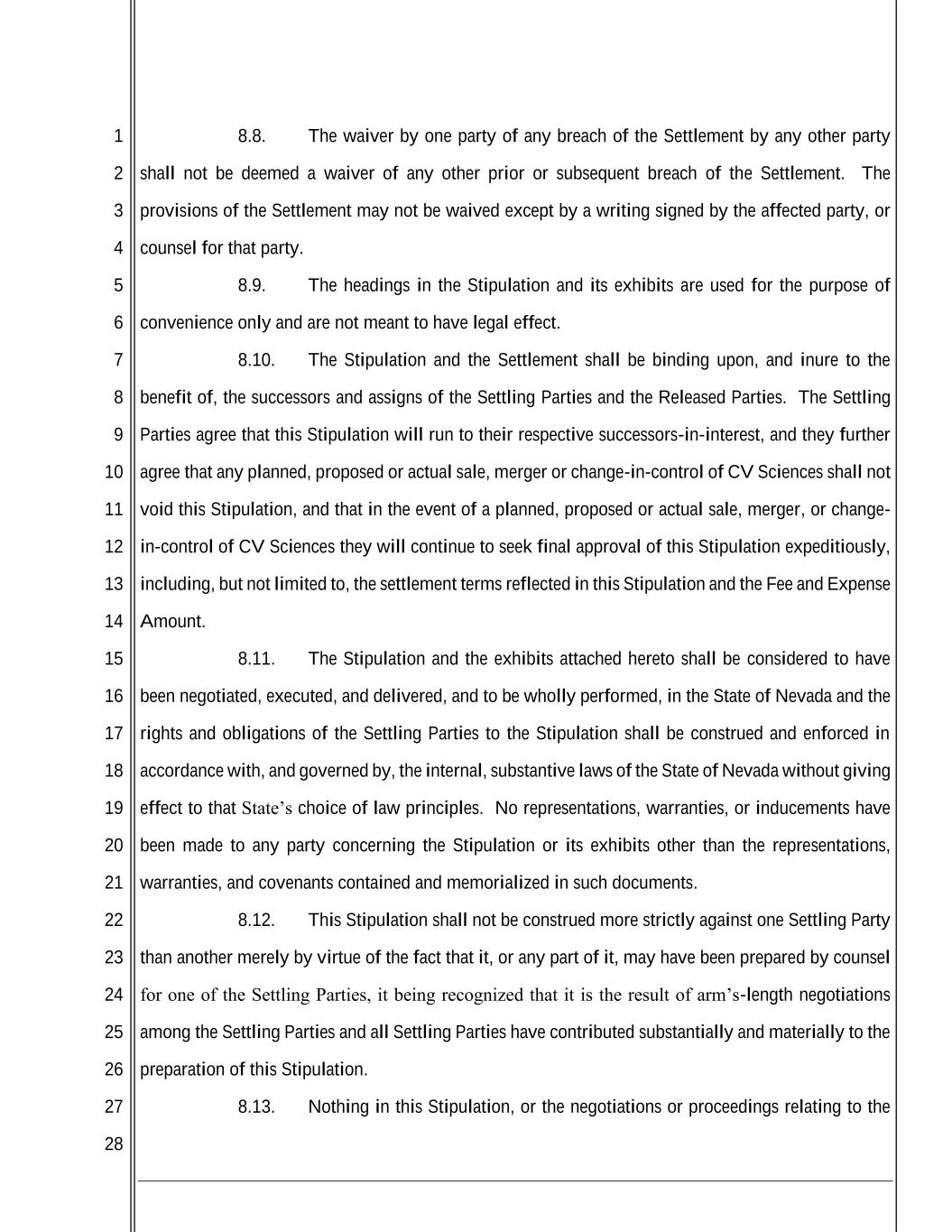 1 2 3 4 5 6 7 8 9 10 11 12 13 14 15 16 17 18 19 20 21 22 23 24 25 26 27 28 8.8. The waiver by one party of any breach of the Settlement by any other party shall not be deemed a waiver of any other prior or subsequent breach of the Settlement. The provisions of the Settlement may not be waived except by a writing signed by the affected party, or counsel for that party. 8.9. The headings in the Stipulation and its exhibits are used for the purpose of convenience only and are not meant to have legal effect. 8.10. The Stipulation and the Settlement shall be binding upon, and inure to the benefit of, the successors and assigns of the Settling Parties and the Released Parties. The Settling Parties agree that this Stipulation will run to their respective successors-in-interest, and they further agree that any planned, proposed or actual sale, merger or change-in-control of CV Sciences shall not void this Stipulation, and that in the event of a planned, proposed or actual sale, merger, or change- in-control of CV Sciences they will continue to seek final approval of this Stipulation expeditiously, including, but not limited to, the settlement terms reflected in this Stipulation and the Fee and Expense Amount. 8.11. The Stipulation and the exhibits attached hereto shall be considered to have been negotiated, executed, and delivered, and to be wholly performed, in the State of Nevada and the rights and obligations of the Settling Parties to the Stipulation shall be construed and enforced in accordance with, and governed by, the internal, substantive laws of the State of Nevada without giving effect to that State’s choice of law principles. No representations, warranties, or inducements have been made to any party concerning the Stipulation or its exhibits other than the representations, warranties, and covenants contained and memorialized in such documents. 8.12. This Stipulation shall not be construed more strictly against one Settling Party than another merely by virtue of the fact that it, or any part of it, may have been prepared by counsel for one of the Settling Parties, it being recognized that it is the result of arm’s-length negotiations among the Settling Parties and all Settling Parties have contributed substantially and materially to the preparation of this Stipulation. 8.13. Nothing in this Stipulation, or the negotiations or proceedings relating to the