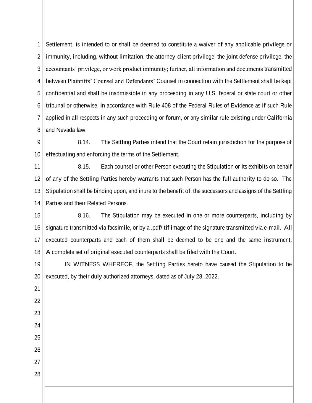 1 2 3 4 5 6 7 8 9 10 11 12 13 14 15 16 17 18 19 20 21 22 23 24 25 26 27 28 Settlement, is intended to or shall be deemed to constitute a waiver of any applicable privilege or immunity, including, without limitation, the attorney-client privilege, the joint defense privilege, the accountants’ privilege, or work product immunity; further, all information and documents transmitted between Plaintiffs’ Counsel and Defendants’ Counsel in connection with the Settlement shall be kept confidential and shall be inadmissible in any proceeding in any U.S. federal or state court or other tribunal or otherwise, in accordance with Rule 408 of the Federal Rules of Evidence as if such Rule applied in all respects in any such proceeding or forum, or any similar rule existing under California and Nevada law. 8.14. The Settling Parties intend that the Court retain jurisdiction for the purpose of effectuating and enforcing the terms of the Settlement. 8.15. Each counsel or other Person executing the Stipulation or its exhibits on behalf of any of the Settling Parties hereby warrants that such Person has the full authority to do so. The Stipulation shall be binding upon, and inure to the benefit of, the successors and assigns of the Settling Parties and their Related Persons. 8.16. The Stipulation may be executed in one or more counterparts, including by signature transmitted via facsimile, or by a .pdf/.tif image of the signature transmitted via e-mail. All executed counterparts and each of them shall be deemed to be one and the same instrument. A complete set of original executed counterparts shall be filed with the Court. IN WITNESS WHEREOF, the Settling Parties hereto have caused the Stipulation to be executed, by their duly authorized attorneys, dated as of July 28, 2022.