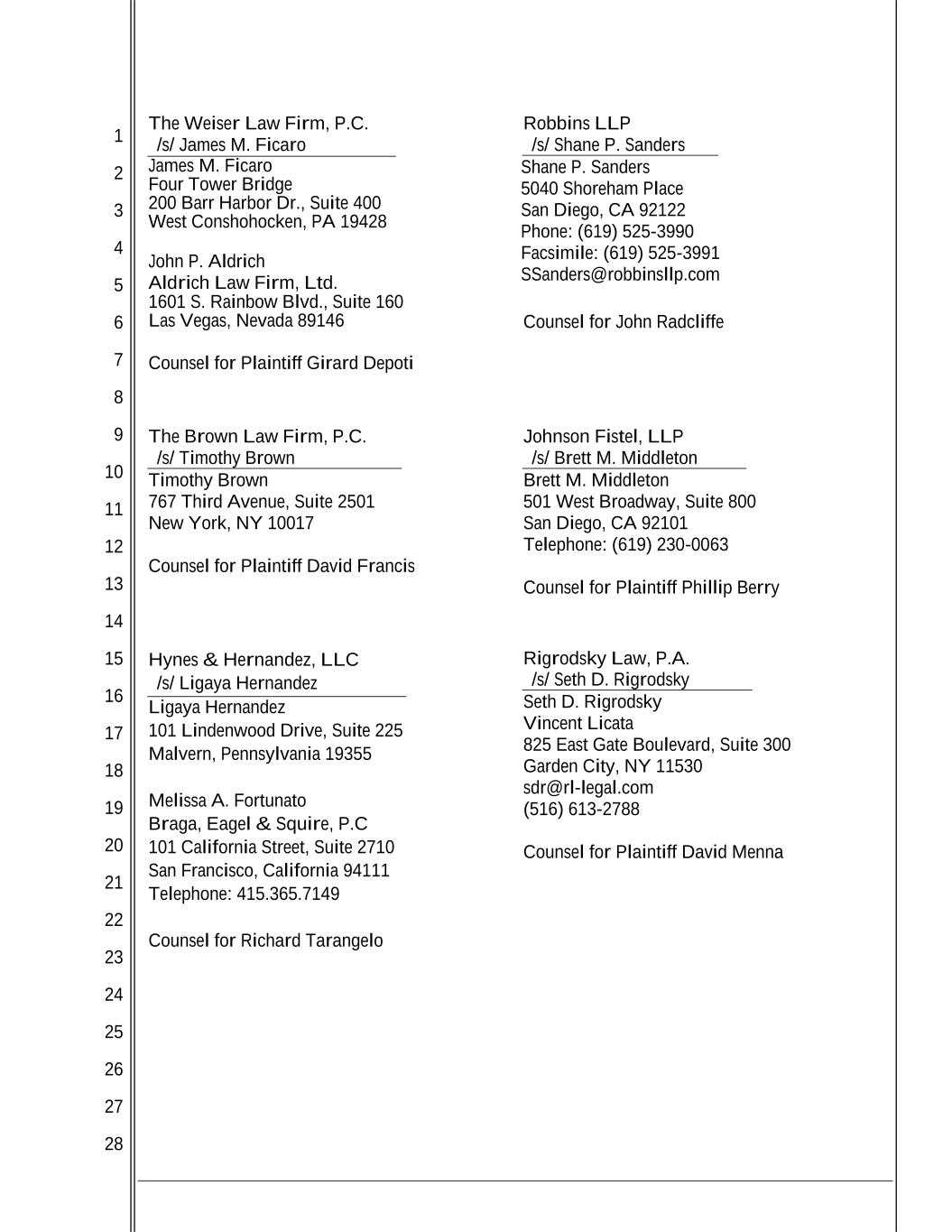 1 2 3 4 5 6 7 8 9 10 11 12 13 14 15 16 17 18 19 20 21 22 23 24 25 26 27 28 The Weiser Law Firm, P.C. /s/ James M. Ficaro James M. Ficaro Four Tower Bridge 200 Barr Harbor Dr., Suite 400 West Conshohocken, PA 19428 John P. Aldrich Aldrich Law Firm, Ltd. 1601 S. Rainbow Blvd., Suite 160 Las Vegas, Nevada 89146 Counsel for Plaintiff Girard Depoti Robbins LLP /s/ Shane P. Sanders Shane P. Sanders 5040 Shoreham Place San Diego, CA 92122 Phone: (619) 525-3990 Facsimile: (619) 525-3991 SSanders@robbinsllp.com Counsel for John Radcliffe The Brown Law Firm, P.C. /s/ Timothy Brown Timothy Brown 767 Third Avenue, Suite 2501 New York, NY 10017 Counsel for Plaintiff David Francis Johnson Fistel, LLP /s/ Brett M. Middleton Brett M. Middleton 501 West Broadway, Suite 800 San Diego, CA 92101 Telephone: (619) 230-0063 Counsel for Plaintiff Phillip Berry Hynes & Hernandez, LLC /s/ Ligaya Hernandez Ligaya Hernandez 101 Lindenwood Drive, Suite 225 Malvern, Pennsylvania 19355 Melissa A. Fortunato Braga, Eagel & Squire, P.C 101 California Street, Suite 2710 San Francisco, California 94111 Telephone: 415.365.7149 Counsel for Richard Tarangelo Rigrodsky Law, P.A. /s/ Seth D. Rigrodsky Seth D. Rigrodsky Vincent Licata 825 East Gate Boulevard, Suite 300 Garden City, NY 11530 sdr@rl-legal.com (516) 613-2788 Counsel for Plaintiff David Menna