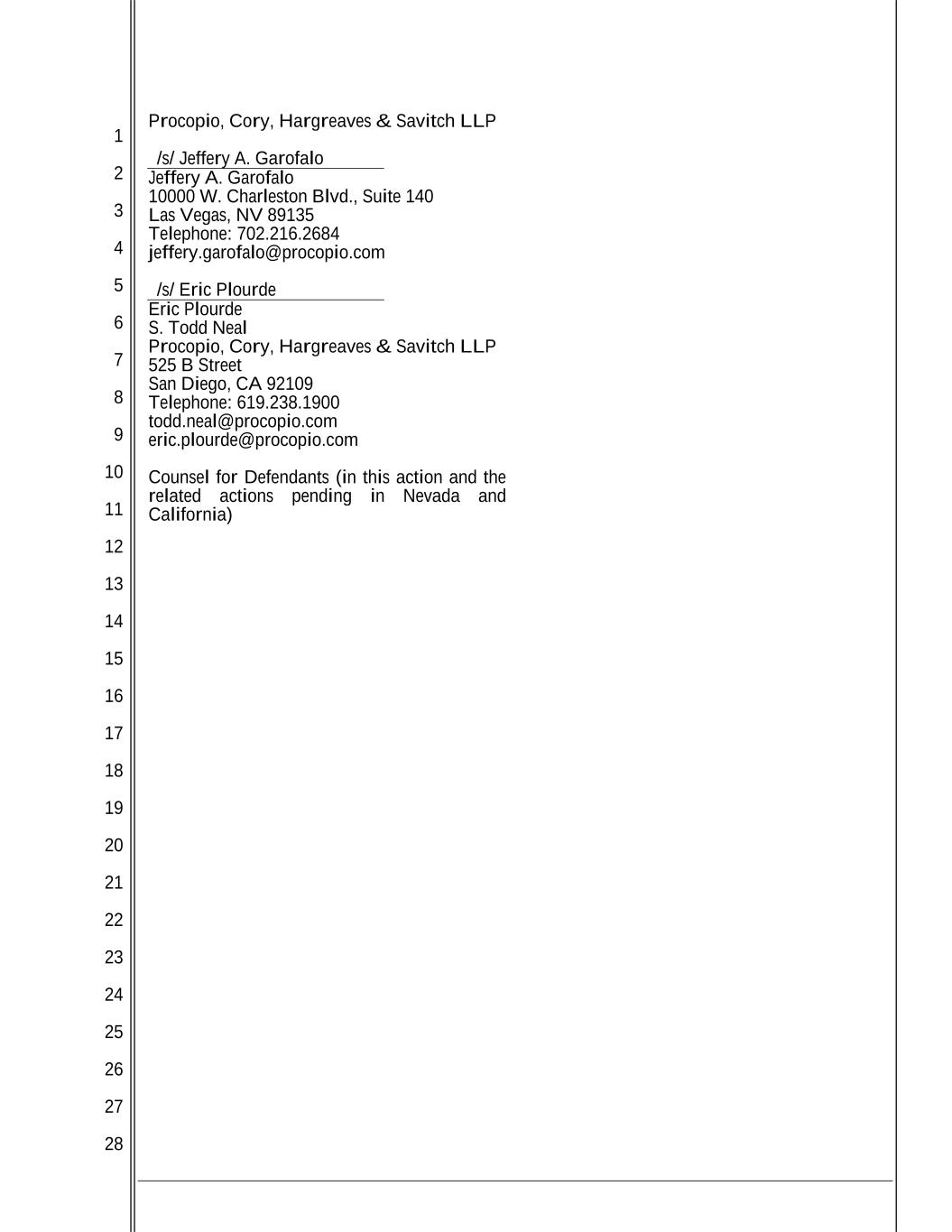 1 2 3 4 5 6 7 8 9 10 11 12 13 14 15 16 17 18 19 20 21 22 23 24 25 26 27 28 Procopio, Cory, Hargreaves & Savitch LLP /s/ Jeffery A. Garofalo Jeffery A. Garofalo 10000 W. Charleston Blvd., Suite 140 Las Vegas, NV 89135 Telephone: 702.216.2684 jeffery.garofalo@procopio.com /s/ Eric Plourde Eric Plourde S. Todd Neal Procopio, Cory, Hargreaves & Savitch LLP 525 B Street San Diego, CA 92109 Telephone: 619.238.1900 todd.neal@procopio.com eric.plourde@procopio.com Counsel for Defendants (in this action and the related actions pending in Nevada and California)