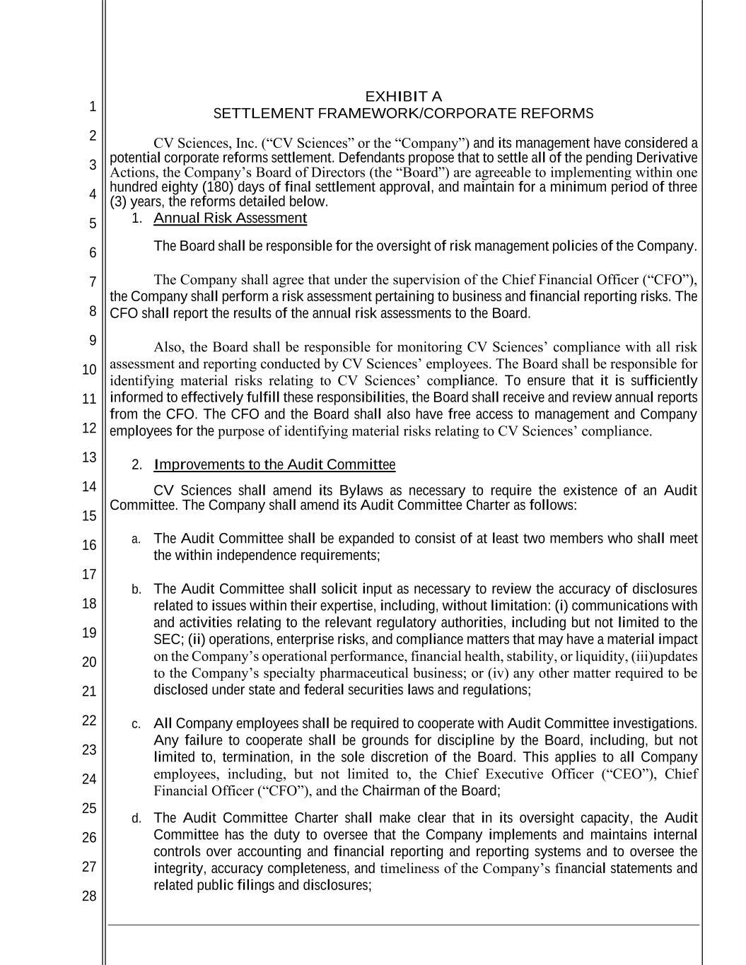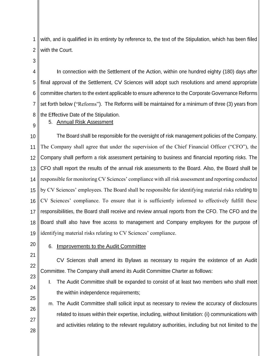 1 2 3 4 5 6 7 8 9 10 11 12 13 14 15 16 17 18 19 20 21 22 23 24 25 26 27 28 with, and is qualified in its entirety by reference to, the text of the Stipulation, which has been filed with the Court. In connection with the Settlement of the Action, within one hundred eighty (180) days after final approval of the Settlement, CV Sciences will adopt such resolutions and amend appropriate committee charters to the extent applicable to ensure adherence to the Corporate Governance Reforms set forth below (“Reforms”). The Reforms will be maintained for a minimum of three (3) years from the Effective Date of the Stipulation. 5. Annual Risk Assessment The Board shall be responsible for the oversight of risk management policies of the Company. The Company shall agree that under the supervision of the Chief Financial Officer (“CFO”), the Company shall perform a risk assessment pertaining to business and financial reporting risks. The CFO shall report the results of the annual risk assessments to the Board. Also, the Board shall be responsible for monitoring CV Sciences’ compliance with all risk assessment and reporting conducted by CV Sciences’ employees. The Board shall be responsible for identifying material risks relating to CV Sciences’ compliance. To ensure that it is sufficiently informed to effectively fulfill these responsibilities, the Board shall receive and review annual reports from the CFO. The CFO and the Board shall also have free access to management and Company employees for the purpose of identifying material risks relating to CV Sciences’ compliance. 6. Improvements to the Audit Committee CV Sciences shall amend its Bylaws as necessary to require the existence of an Audit Committee. The Company shall amend its Audit Committee Charter as follows: l. The Audit Committee shall be expanded to consist of at least two members who shall meet the within independence requirements; m. The Audit Committee shall solicit input as necessary to review the accuracy of disclosures related to issues within their expertise, including, without limitation: (i) communications with and activities relating to the relevant regulatory authorities, including but not limited to the