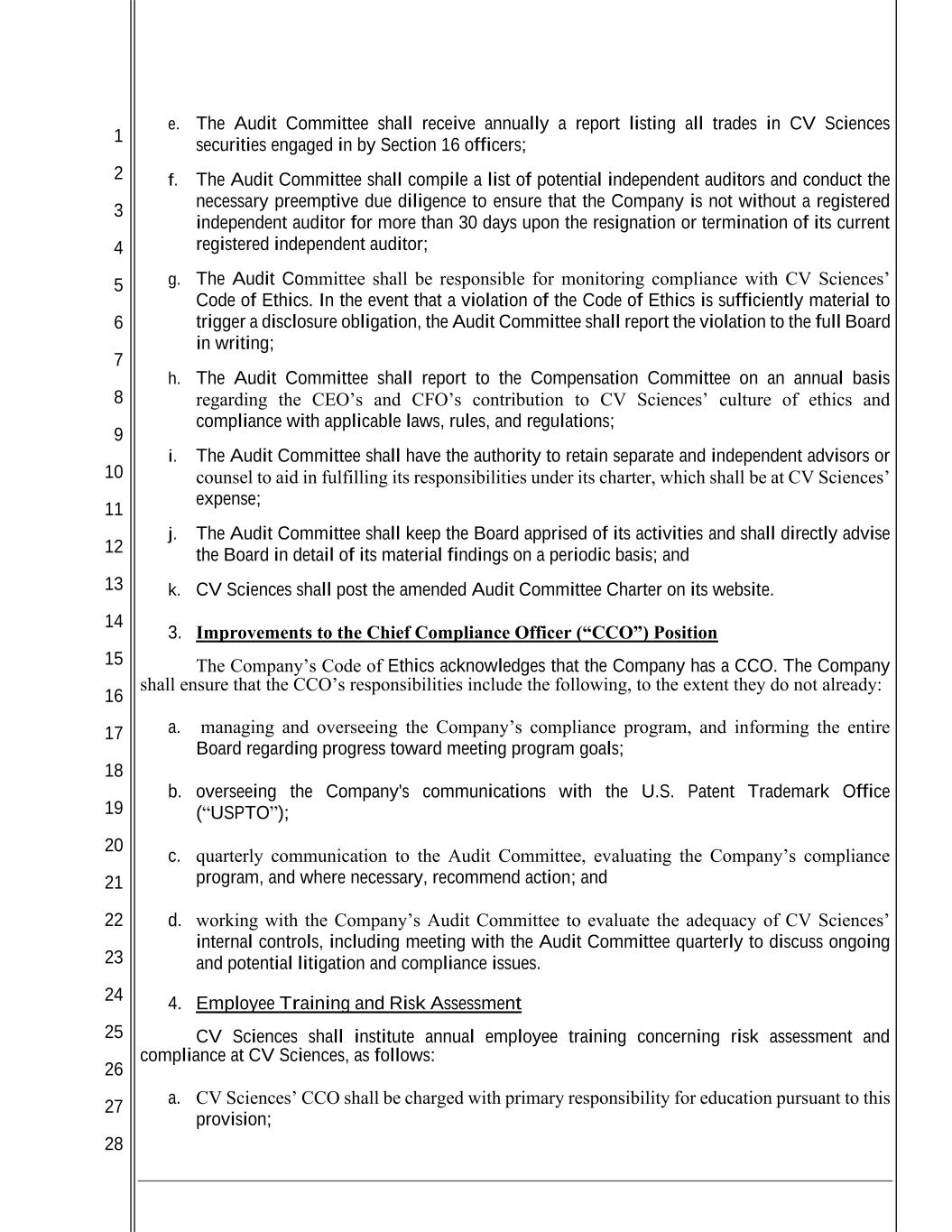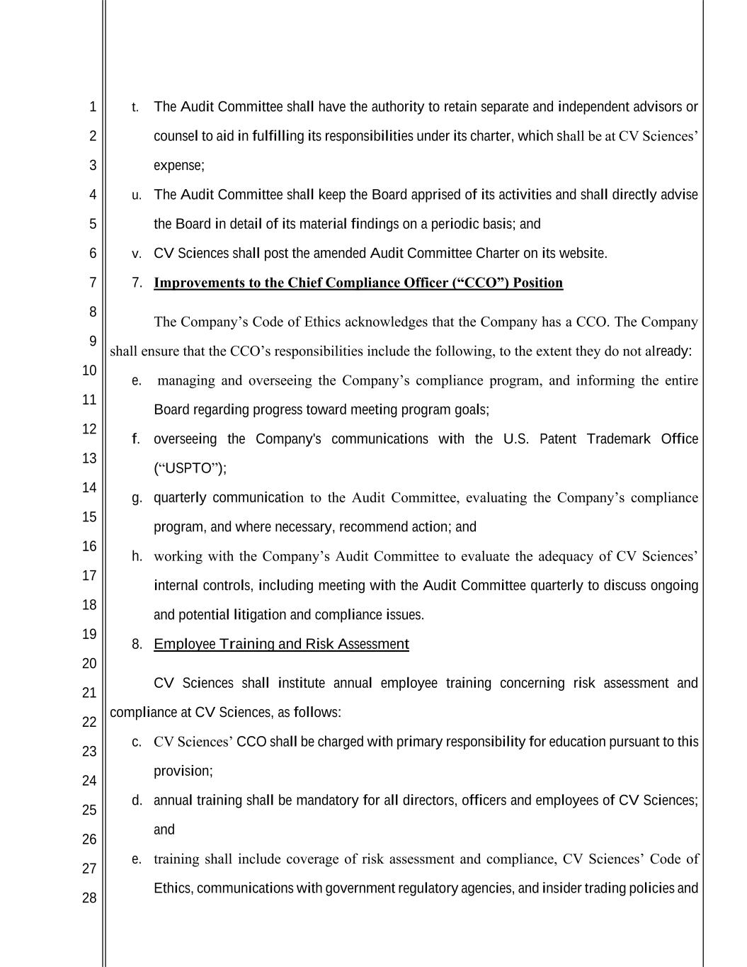 1 2 3 4 5 6 7 8 9 10 11 12 13 14 15 16 17 18 19 20 21 22 23 24 25 26 27 28 t. The Audit Committee shall have the authority to retain separate and independent advisors or counsel to aid in fulfilling its responsibilities under its charter, which shall be at CV Sciences’ expense; u. The Audit Committee shall keep the Board apprised of its activities and shall directly advise the Board in detail of its material findings on a periodic basis; and v. CV Sciences shall post the amended Audit Committee Charter on its website. 7. Improvements to the Chief Compliance Officer (“CCO”) Position The Company’s Code of Ethics acknowledges that the Company has a CCO. The Company shall ensure that the CCO’s responsibilities include the following, to the extent they do not already: e. managing and overseeing the Company’s compliance program, and informing the entire Board regarding progress toward meeting program goals; f. overseeing the Company's communications with the U.S. Patent Trademark Office (“USPTO”); g. quarterly communication to the Audit Committee, evaluating the Company’s compliance program, and where necessary, recommend action; and h. working with the Company’s Audit Committee to evaluate the adequacy of CV Sciences’ internal controls, including meeting with the Audit Committee quarterly to discuss ongoing and potential litigation and compliance issues. 8. Employee Training and Risk Assessment CV Sciences shall institute annual employee training concerning risk assessment and compliance at CV Sciences, as follows: c. CV Sciences’ CCO shall be charged with primary responsibility for education pursuant to this provision; d. annual training shall be mandatory for all directors, officers and employees of CV Sciences; and e. training shall include coverage of risk assessment and compliance, CV Sciences’ Code of Ethics, communications with government regulatory agencies, and insider trading policies and