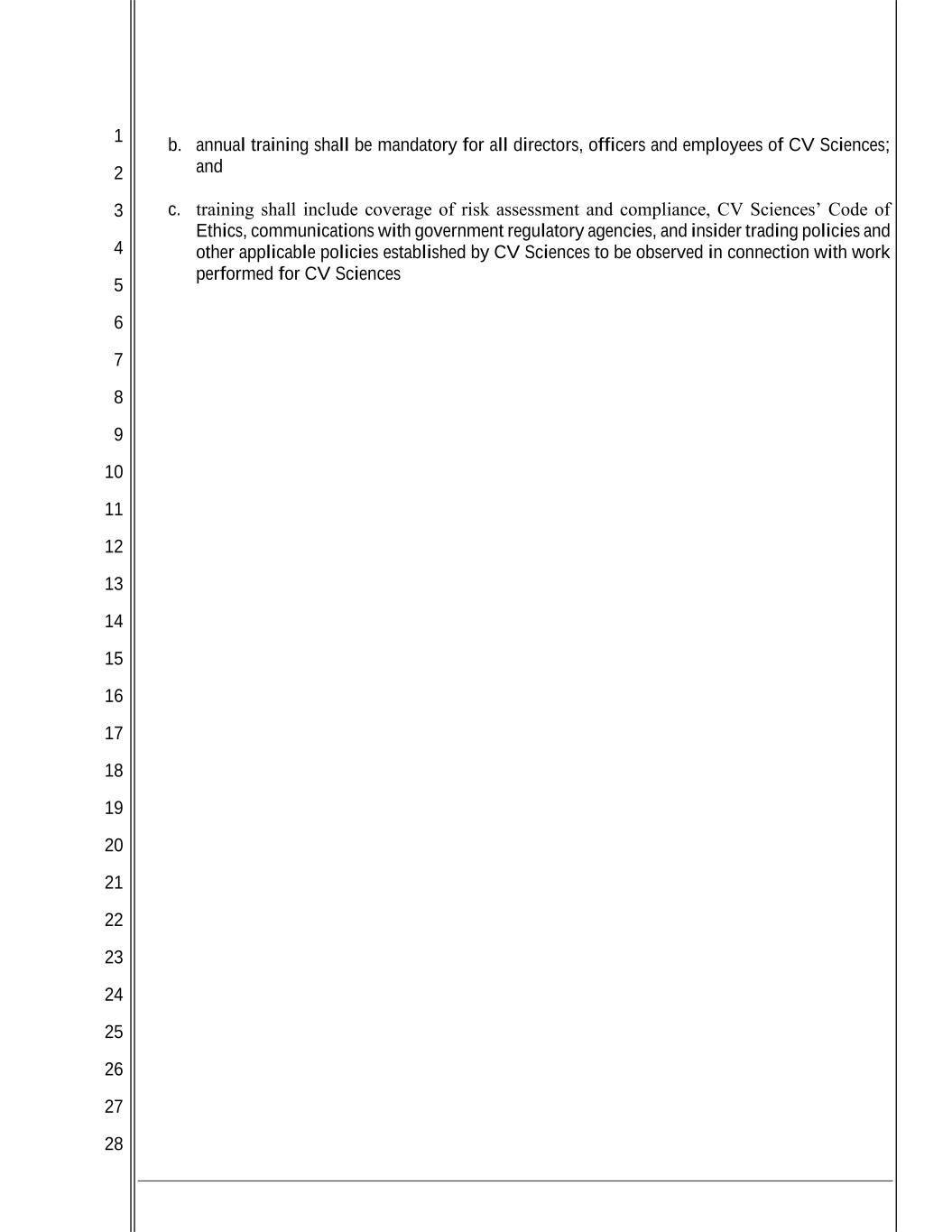 1 2 3 4 5 6 7 8 9 10 11 12 13 14 15 16 17 18 19 20 21 22 23 24 25 26 27 28 b. annual training shall be mandatory for all directors, officers and employees of CV Sciences; and c. training shall include coverage of risk assessment and compliance, CV Sciences’ Code of Ethics, communications with government regulatory agencies, and insider trading policies and other applicable policies established by CV Sciences to be observed in connection with work performed for CV Sciences