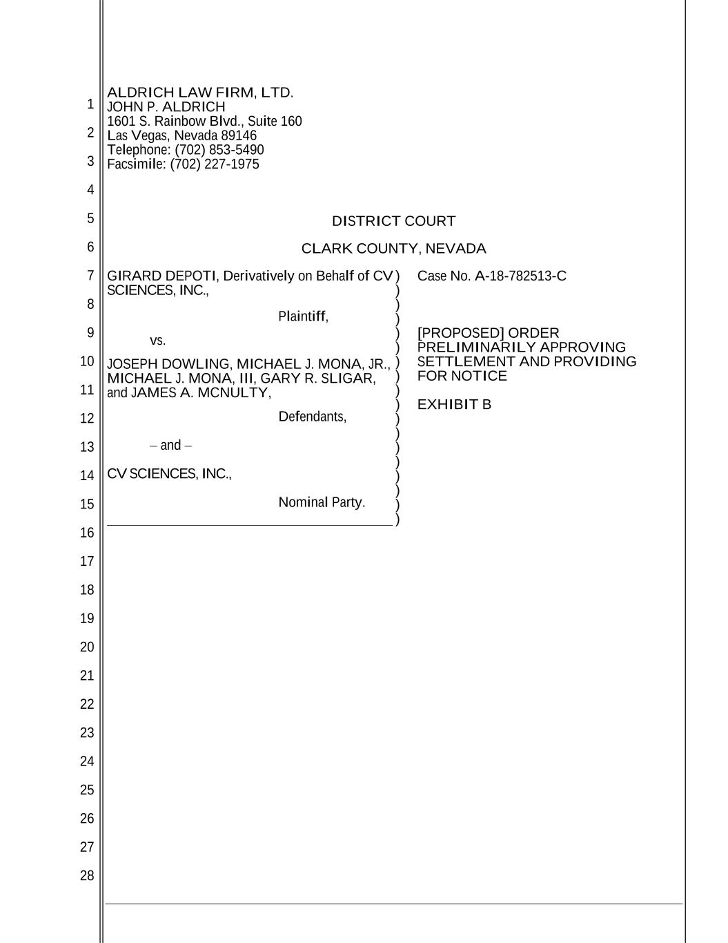 1 2 3 4 5 6 7 8 9 10 11 12 13 14 15 16 17 18 19 20 21 22 23 24 25 26 27 28 ALDRICH LAW FIRM, LTD. JOHN P. ALDRICH 1601 S. Rainbow Blvd., Suite 160 Las Vegas, Nevada 89146 Telephone: (702) 853-5490 Facsimile: (702) 227-1975 DISTRICT COURT CLARK COUNTY, NEVADA GIRARD DEPOTI, Derivatively on Behalf of CV SCIENCES, INC., Plaintiff, vs. JOSEPH DOWLING, MICHAEL J. MONA, JR., MICHAEL J. MONA, III, GARY R. SLIGAR, and JAMES A. MCNULTY, Defendants, – and – CV SCIENCES, INC., Nominal Party. ) ) ) ) ) ) ) ) ) ) ) ) ) ) ) ) ) ) Case No. A-18-782513-C [PROPOSED] ORDER PRELIMINARILY APPROVING SETTLEMENT AND PROVIDING FOR NOTICE EXHIBIT B