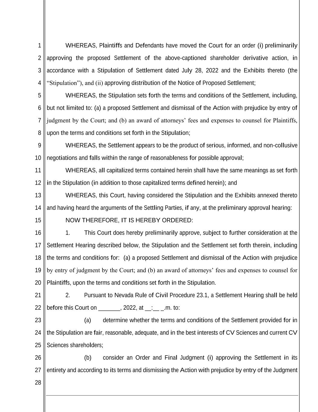 1 2 3 4 5 6 7 8 9 10 11 12 13 14 15 16 17 18 19 20 21 22 23 24 25 26 27 28 WHEREAS, Plaintiffs and Defendants have moved the Court for an order (i) preliminarily approving the proposed Settlement of the above-captioned shareholder derivative action, in accordance with a Stipulation of Settlement dated July 28, 2022 and the Exhibits thereto (the “Stipulation”), and (ii) approving distribution of the Notice of Proposed Settlement; WHEREAS, the Stipulation sets forth the terms and conditions of the Settlement, including, but not limited to: (a) a proposed Settlement and dismissal of the Action with prejudice by entry of judgment by the Court; and (b) an award of attorneys’ fees and expenses to counsel for Plaintiffs, upon the terms and conditions set forth in the Stipulation; WHEREAS, the Settlement appears to be the product of serious, informed, and non-collusive negotiations and falls within the range of reasonableness for possible approval; WHEREAS, all capitalized terms contained herein shall have the same meanings as set forth in the Stipulation (in addition to those capitalized terms defined herein); and WHEREAS, this Court, having considered the Stipulation and the Exhibits annexed thereto and having heard the arguments of the Settling Parties, if any, at the preliminary approval hearing: NOW THEREFORE, IT IS HEREBY ORDERED: 1. This Court does hereby preliminarily approve, subject to further consideration at the Settlement Hearing described below, the Stipulation and the Settlement set forth therein, including the terms and conditions for: (a) a proposed Settlement and dismissal of the Action with prejudice by entry of judgment by the Court; and (b) an award of attorneys’ fees and expenses to counsel for Plaintiffs, upon the terms and conditions set forth in the Stipulation. 2. Pursuant to Nevada Rule of Civil Procedure 23.1, a Settlement Hearing shall be held before this Court on _______, 2022, at __:__ _.m. to: (a) determine whether the terms and conditions of the Settlement provided for in the Stipulation are fair, reasonable, adequate, and in the best interests of CV Sciences and current CV Sciences shareholders; (b) consider an Order and Final Judgment (i) approving the Settlement in its entirety and according to its terms and dismissing the Action with prejudice by entry of the Judgment