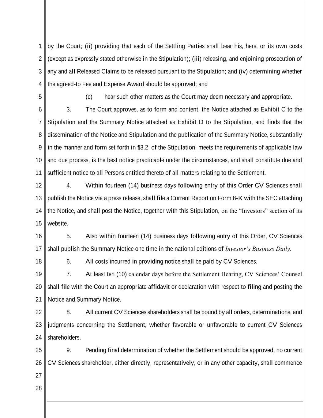 1 2 3 4 5 6 7 8 9 10 11 12 13 14 15 16 17 18 19 20 21 22 23 24 25 26 27 28 by the Court; (ii) providing that each of the Settling Parties shall bear his, hers, or its own costs (except as expressly stated otherwise in the Stipulation); (iii) releasing, and enjoining prosecution of any and all Released Claims to be released pursuant to the Stipulation; and (iv) determining whether the agreed-to Fee and Expense Award should be approved; and (c) hear such other matters as the Court may deem necessary and appropriate. 3. The Court approves, as to form and content, the Notice attached as Exhibit C to the Stipulation and the Summary Notice attached as Exhibit D to the Stipulation, and finds that the dissemination of the Notice and Stipulation and the publication of the Summary Notice, substantially in the manner and form set forth in ¶3.2 of the Stipulation, meets the requirements of applicable law and due process, is the best notice practicable under the circumstances, and shall constitute due and sufficient notice to all Persons entitled thereto of all matters relating to the Settlement. 4. Within fourteen (14) business days following entry of this Order CV Sciences shall publish the Notice via a press release, shall file a Current Report on Form 8-K with the SEC attaching the Notice, and shall post the Notice, together with this Stipulation, on the “Investors” section of its website. 5. Also within fourteen (14) business days following entry of this Order, CV Sciences shall publish the Summary Notice one time in the national editions of Investor’s Business Daily. 6. All costs incurred in providing notice shall be paid by CV Sciences. 7. At least ten (10) calendar days before the Settlement Hearing, CV Sciences’ Counsel shall file with the Court an appropriate affidavit or declaration with respect to filing and posting the Notice and Summary Notice. 8. All current CV Sciences shareholders shall be bound by all orders, determinations, and judgments concerning the Settlement, whether favorable or unfavorable to current CV Sciences shareholders. 9. Pending final determination of whether the Settlement should be approved, no current CV Sciences shareholder, either directly, representatively, or in any other capacity, shall commence