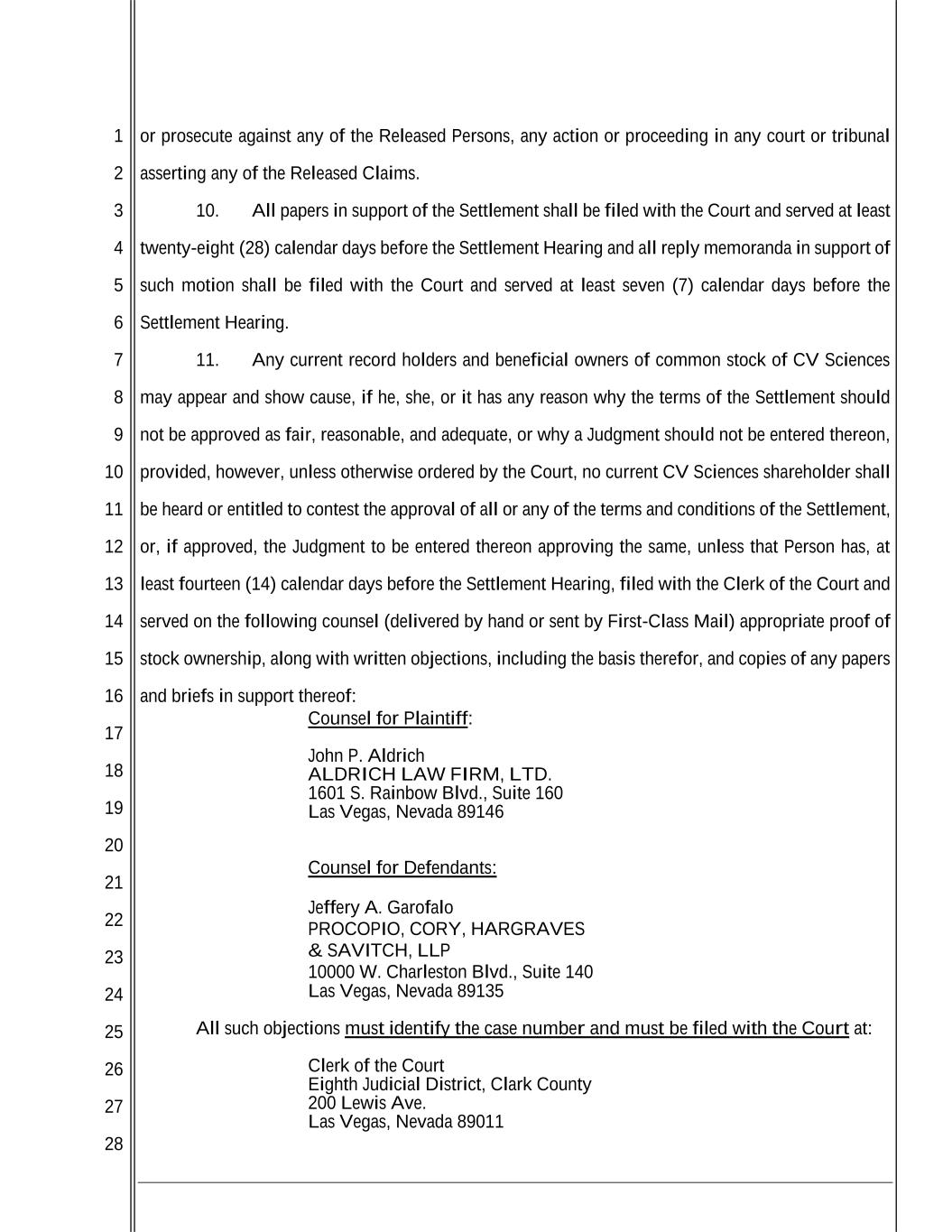 1 2 3 4 5 6 7 8 9 10 11 12 13 14 15 16 17 18 19 20 21 22 23 24 25 26 27 28 or prosecute against any of the Released Persons, any action or proceeding in any court or tribunal asserting any of the Released Claims. 10. All papers in support of the Settlement shall be filed with the Court and served at least twenty-eight (28) calendar days before the Settlement Hearing and all reply memoranda in support of such motion shall be filed with the Court and served at least seven (7) calendar days before the Settlement Hearing. 11. Any current record holders and beneficial owners of common stock of CV Sciences may appear and show cause, if he, she, or it has any reason why the terms of the Settlement should not be approved as fair, reasonable, and adequate, or why a Judgment should not be entered thereon, provided, however, unless otherwise ordered by the Court, no current CV Sciences shareholder shall be heard or entitled to contest the approval of all or any of the terms and conditions of the Settlement, or, if approved, the Judgment to be entered thereon approving the same, unless that Person has, at least fourteen (14) calendar days before the Settlement Hearing, filed with the Clerk of the Court and served on the following counsel (delivered by hand or sent by First-Class Mail) appropriate proof of stock ownership, along with written objections, including the basis therefor, and copies of any papers and briefs in support thereof: Counsel for Plaintiff: John P. Aldrich ALDRICH LAW FIRM, LTD. 1601 S. Rainbow Blvd., Suite 160 Las Vegas, Nevada 89146 Counsel for Defendants: Jeffery A. Garofalo PROCOPIO, CORY, HARGRAVES & SAVITCH, LLP 10000 W. Charleston Blvd., Suite 140 Las Vegas, Nevada 89135 All such objections must identify the case number and must be filed with the Court at: Clerk of the Court Eighth Judicial District, Clark County 200 Lewis Ave. Las Vegas, Nevada 89011