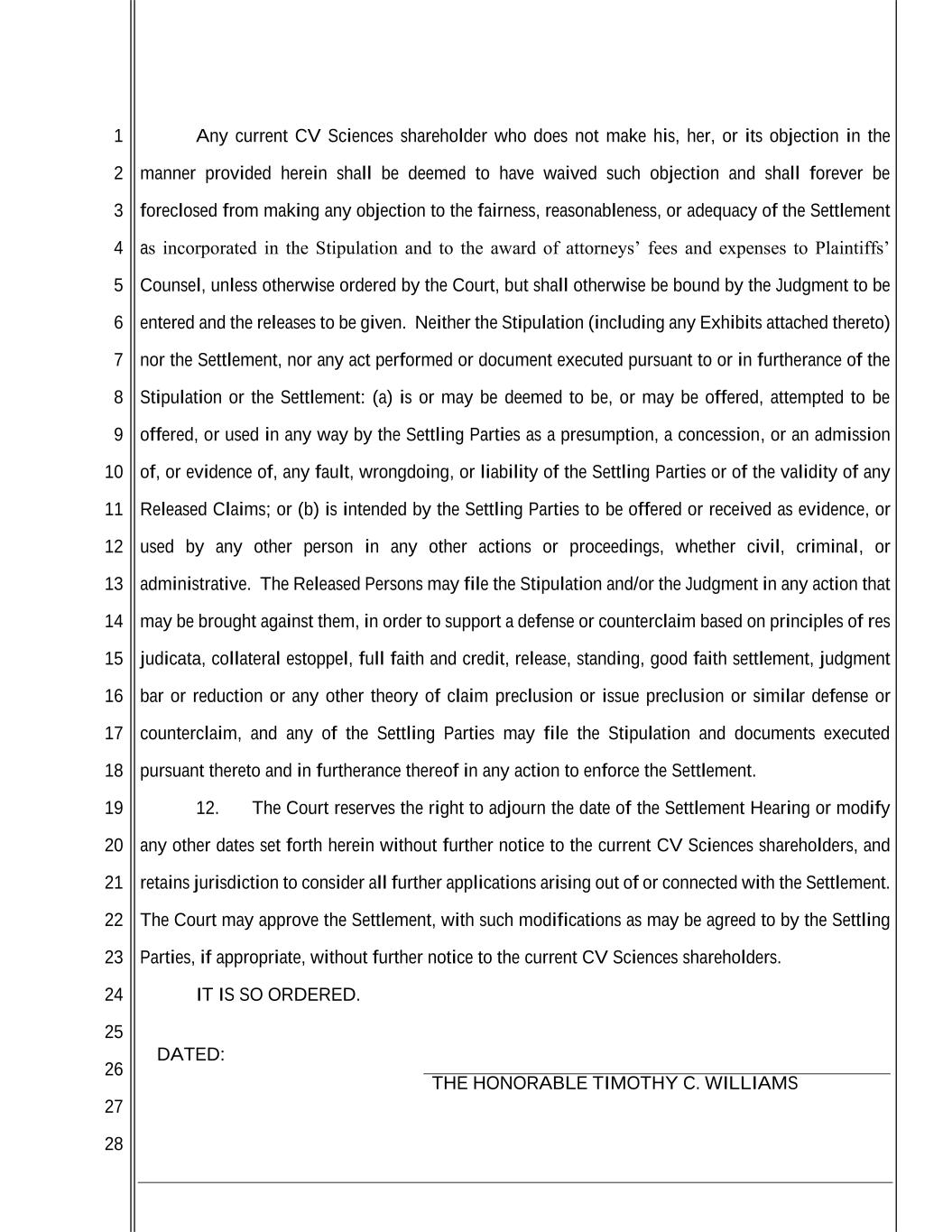 1 2 3 4 5 6 7 8 9 10 11 12 13 14 15 16 17 18 19 20 21 22 23 24 25 26 27 28 Any current CV Sciences shareholder who does not make his, her, or its objection in the manner provided herein shall be deemed to have waived such objection and shall forever be foreclosed from making any objection to the fairness, reasonableness, or adequacy of the Settlement as incorporated in the Stipulation and to the award of attorneys’ fees and expenses to Plaintiffs’ Counsel, unless otherwise ordered by the Court, but shall otherwise be bound by the Judgment to be entered and the releases to be given. Neither the Stipulation (including any Exhibits attached thereto) nor the Settlement, nor any act performed or document executed pursuant to or in furtherance of the Stipulation or the Settlement: (a) is or may be deemed to be, or may be offered, attempted to be offered, or used in any way by the Settling Parties as a presumption, a concession, or an admission of, or evidence of, any fault, wrongdoing, or liability of the Settling Parties or of the validity of any Released Claims; or (b) is intended by the Settling Parties to be offered or received as evidence, or used by any other person in any other actions or proceedings, whether civil, criminal, or administrative. The Released Persons may file the Stipulation and/or the Judgment in any action that may be brought against them, in order to support a defense or counterclaim based on principles of res judicata, collateral estoppel, full faith and credit, release, standing, good faith settlement, judgment bar or reduction or any other theory of claim preclusion or issue preclusion or similar defense or counterclaim, and any of the Settling Parties may file the Stipulation and documents executed pursuant thereto and in furtherance thereof in any action to enforce the Settlement. 12. The Court reserves the right to adjourn the date of the Settlement Hearing or modify any other dates set forth herein without further notice to the current CV Sciences shareholders, and retains jurisdiction to consider all further applications arising out of or connected with the Settlement. The Court may approve the Settlement, with such modifications as may be agreed to by the Settling Parties, if appropriate, without further notice to the current CV Sciences shareholders. IT IS SO ORDERED. DATED: THE HONORABLE TIMOTHY C. WILLIAMS