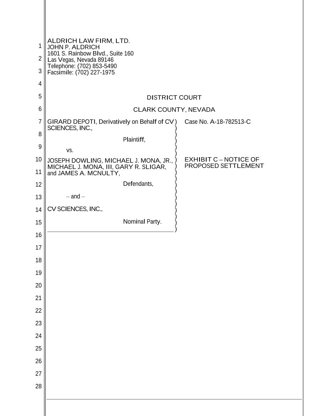 1 2 3 4 5 6 7 8 9 10 11 12 13 14 15 16 17 18 19 20 21 22 23 24 25 26 27 28 ALDRICH LAW FIRM, LTD. JOHN P. ALDRICH 1601 S. Rainbow Blvd., Suite 160 Las Vegas, Nevada 89146 Telephone: (702) 853-5490 Facsimile: (702) 227-1975 DISTRICT COURT CLARK COUNTY, NEVADA GIRARD DEPOTI, Derivatively on Behalf of CV SCIENCES, INC., Plaintiff, vs. JOSEPH DOWLING, MICHAEL J. MONA, JR., MICHAEL J. MONA, III, GARY R. SLIGAR, and JAMES A. MCNULTY, Defendants, – and – CV SCIENCES, INC., Nominal Party. ) ) ) ) ) ) ) ) ) ) ) ) ) ) ) ) ) ) Case No. A-18-782513-C EXHIBIT C – NOTICE OF PROPOSED SETTLEMENT