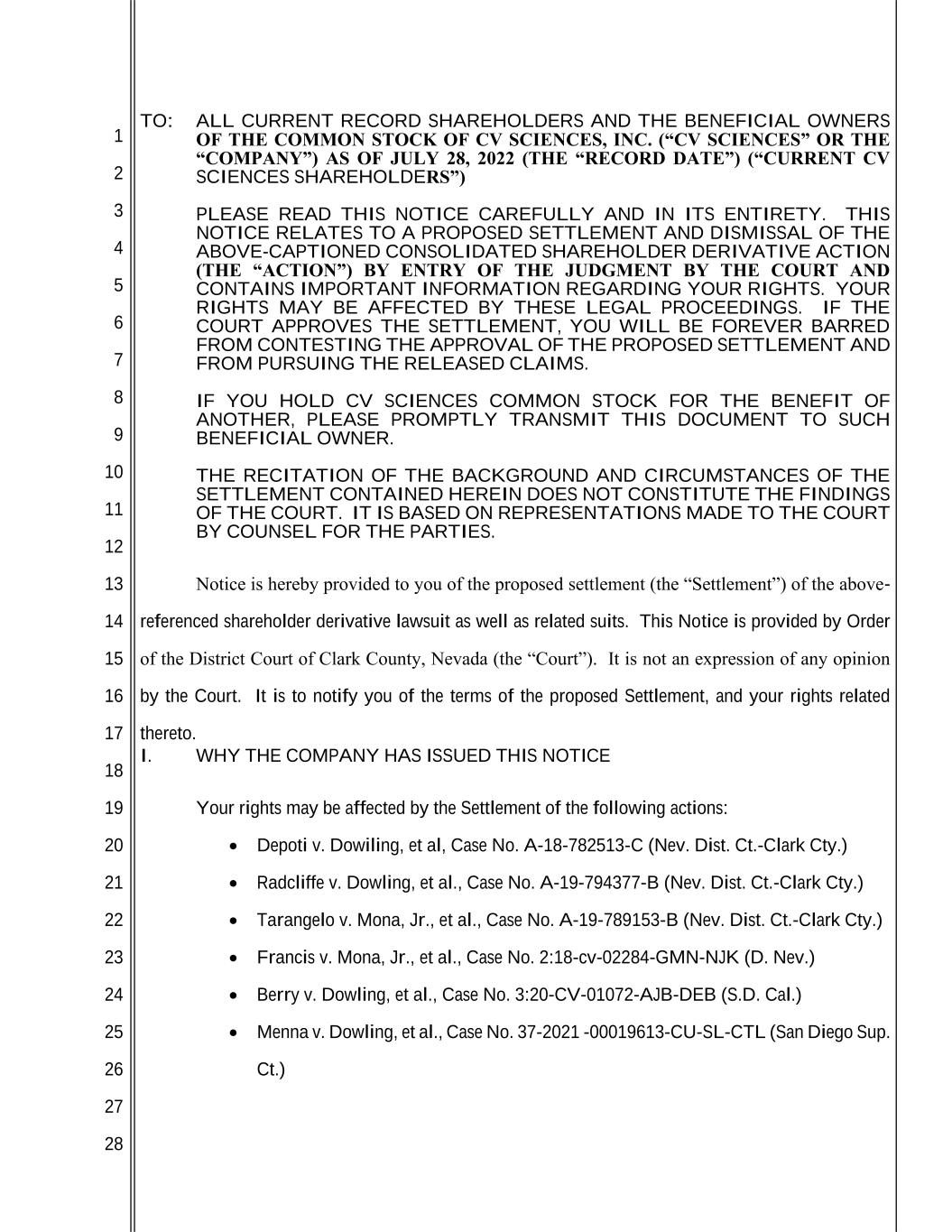 1 2 3 4 5 6 7 8 9 10 11 12 13 14 15 16 17 18 19 20 21 22 23 24 25 26 27 28 TO: ALL CURRENT RECORD SHAREHOLDERS AND THE BENEFICIAL OWNERS OF THE COMMON STOCK OF CV SCIENCES, INC. (“CV SCIENCES” OR THE “COMPANY”) AS OF JULY 28, 2022 (THE “RECORD DATE”) (“CURRENT CV SCIENCES SHAREHOLDERS”) PLEASE READ THIS NOTICE CAREFULLY AND IN ITS ENTIRETY. THIS NOTICE RELATES TO A PROPOSED SETTLEMENT AND DISMISSAL OF THE ABOVE-CAPTIONED CONSOLIDATED SHAREHOLDER DERIVATIVE ACTION (THE “ACTION”) BY ENTRY OF THE JUDGMENT BY THE COURT AND CONTAINS IMPORTANT INFORMATION REGARDING YOUR RIGHTS. YOUR RIGHTS MAY BE AFFECTED BY THESE LEGAL PROCEEDINGS. IF THE COURT APPROVES THE SETTLEMENT, YOU WILL BE FOREVER BARRED FROM CONTESTING THE APPROVAL OF THE PROPOSED SETTLEMENT AND FROM PURSUING THE RELEASED CLAIMS. IF YOU HOLD CV SCIENCES COMMON STOCK FOR THE BENEFIT OF ANOTHER, PLEASE PROMPTLY TRANSMIT THIS DOCUMENT TO SUCH BENEFICIAL OWNER. THE RECITATION OF THE BACKGROUND AND CIRCUMSTANCES OF THE SETTLEMENT CONTAINED HEREIN DOES NOT CONSTITUTE THE FINDINGS OF THE COURT. IT IS BASED ON REPRESENTATIONS MADE TO THE COURT BY COUNSEL FOR THE PARTIES. Notice is hereby provided to you of the proposed settlement (the “Settlement”) of the above- referenced shareholder derivative lawsuit as well as related suits. This Notice is provided by Order of the District Court of Clark County, Nevada (the “Court”). It is not an expression of any opinion by the Court. It is to notify you of the terms of the proposed Settlement, and your rights related thereto. I. WHY THE COMPANY HAS ISSUED THIS NOTICE Your rights may be affected by the Settlement of the following actions: • Depoti v. Dowiling, et al, Case No. A-18-782513-C (Nev. Dist. Ct.-Clark Cty.) • Radcliffe v. Dowling, et al., Case No. A-19-794377-B (Nev. Dist. Ct.-Clark Cty.) • Tarangelo v. Mona, Jr., et al., Case No. A-19-789153-B (Nev. Dist. Ct.-Clark Cty.) • Francis v. Mona, Jr., et al., Case No. 2:18-cv-02284-GMN-NJK (D. Nev.) • Berry v. Dowling, et al., Case No. 3:20-CV-01072-AJB-DEB (S.D. Cal.) • Menna v. Dowling, et al., Case No. 37-2021 -00019613-CU-SL-CTL (San Diego Sup. Ct.)