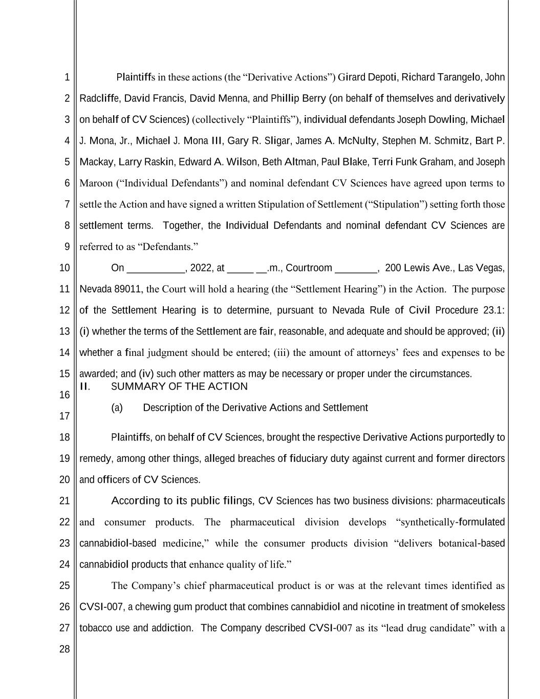 1 2 3 4 5 6 7 8 9 10 11 12 13 14 15 16 17 18 19 20 21 22 23 24 25 26 27 28 Plaintiffs in these actions (the “Derivative Actions”) Girard Depoti, Richard Tarangelo, John Radcliffe, David Francis, David Menna, and Phillip Berry (on behalf of themselves and derivatively on behalf of CV Sciences) (collectively “Plaintiffs”), individual defendants Joseph Dowling, Michael J. Mona, Jr., Michael J. Mona III, Gary R. Sligar, James A. McNulty, Stephen M. Schmitz, Bart P. Mackay, Larry Raskin, Edward A. Wilson, Beth Altman, Paul Blake, Terri Funk Graham, and Joseph Maroon (“Individual Defendants”) and nominal defendant CV Sciences have agreed upon terms to settle the Action and have signed a written Stipulation of Settlement (“Stipulation”) setting forth those settlement terms. Together, the Individual Defendants and nominal defendant CV Sciences are referred to as “Defendants.” On ___________, 2022, at _____ __.m., Courtroom ________, 200 Lewis Ave., Las Vegas, Nevada 89011, the Court will hold a hearing (the “Settlement Hearing”) in the Action. The purpose of the Settlement Hearing is to determine, pursuant to Nevada Rule of Civil Procedure 23.1: (i) whether the terms of the Settlement are fair, reasonable, and adequate and should be approved; (ii) whether a final judgment should be entered; (iii) the amount of attorneys’ fees and expenses to be awarded; and (iv) such other matters as may be necessary or proper under the circumstances. II. SUMMARY OF THE ACTION (a) Description of the Derivative Actions and Settlement Plaintiffs, on behalf of CV Sciences, brought the respective Derivative Actions purportedly to remedy, among other things, alleged breaches of fiduciary duty against current and former directors and officers of CV Sciences. According to its public filings, CV Sciences has two business divisions: pharmaceuticals and consumer products. The pharmaceutical division develops “synthetically-formulated cannabidiol-based medicine,” while the consumer products division “delivers botanical-based cannabidiol products that enhance quality of life.” The Company’s chief pharmaceutical product is or was at the relevant times identified as CVSI-007, a chewing gum product that combines cannabidiol and nicotine in treatment of smokeless tobacco use and addiction. The Company described CVSI-007 as its “lead drug candidate” with a
