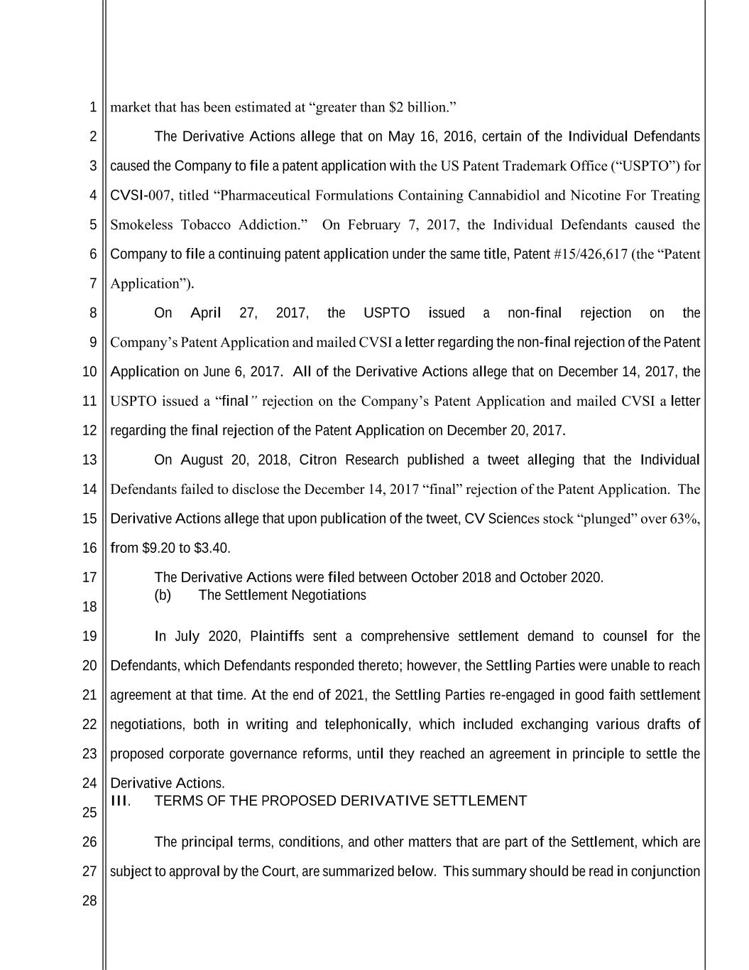 1 2 3 4 5 6 7 8 9 10 11 12 13 14 15 16 17 18 19 20 21 22 23 24 25 26 27 28 market that has been estimated at “greater than $2 billion.” The Derivative Actions allege that on May 16, 2016, certain of the Individual Defendants caused the Company to file a patent application with the US Patent Trademark Office (“USPTO”) for CVSI-007, titled “Pharmaceutical Formulations Containing Cannabidiol and Nicotine For Treating Smokeless Tobacco Addiction.” On February 7, 2017, the Individual Defendants caused the Company to file a continuing patent application under the same title, Patent #15/426,617 (the “Patent Application”). On April 27, 2017, the USPTO issued a non-final rejection on the Company’s Patent Application and mailed CVSI a letter regarding the non-final rejection of the Patent Application on June 6, 2017. All of the Derivative Actions allege that on December 14, 2017, the USPTO issued a “final” rejection on the Company’s Patent Application and mailed CVSI a letter regarding the final rejection of the Patent Application on December 20, 2017. On August 20, 2018, Citron Research published a tweet alleging that the Individual Defendants failed to disclose the December 14, 2017 “final” rejection of the Patent Application. The Derivative Actions allege that upon publication of the tweet, CV Sciences stock “plunged” over 63%, from $9.20 to $3.40. The Derivative Actions were filed between October 2018 and October 2020. (b) The Settlement Negotiations In July 2020, Plaintiffs sent a comprehensive settlement demand to counsel for the Defendants, which Defendants responded thereto; however, the Settling Parties were unable to reach agreement at that time. At the end of 2021, the Settling Parties re-engaged in good faith settlement negotiations, both in writing and telephonically, which included exchanging various drafts of proposed corporate governance reforms, until they reached an agreement in principle to settle the Derivative Actions. III. TERMS OF THE PROPOSED DERIVATIVE SETTLEMENT The principal terms, conditions, and other matters that are part of the Settlement, which are subject to approval by the Court, are summarized below. This summary should be read in conjunction