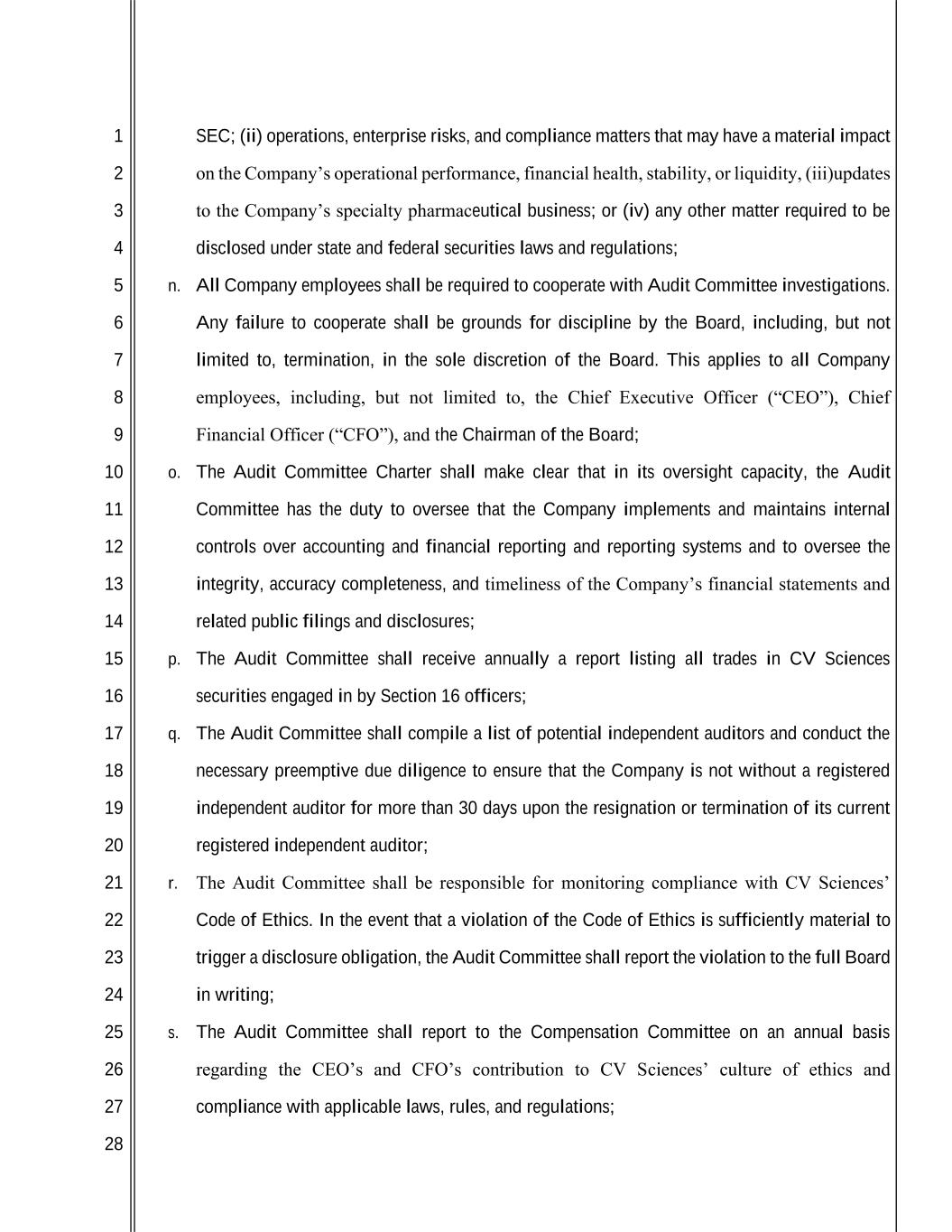 1 2 3 4 5 6 7 8 9 10 11 12 13 14 15 16 17 18 19 20 21 22 23 24 25 26 27 28 SEC; (ii) operations, enterprise risks, and compliance matters that may have a material impact on the Company’s operational performance, financial health, stability, or liquidity, (iii)updates to the Company’s specialty pharmaceutical business; or (iv) any other matter required to be disclosed under state and federal securities laws and regulations; n. All Company employees shall be required to cooperate with Audit Committee investigations. Any failure to cooperate shall be grounds for discipline by the Board, including, but not limited to, termination, in the sole discretion of the Board. This applies to all Company employees, including, but not limited to, the Chief Executive Officer (“CEO”), Chief Financial Officer (“CFO”), and the Chairman of the Board; o. The Audit Committee Charter shall make clear that in its oversight capacity, the Audit Committee has the duty to oversee that the Company implements and maintains internal controls over accounting and financial reporting and reporting systems and to oversee the integrity, accuracy completeness, and timeliness of the Company’s financial statements and related public filings and disclosures; p. The Audit Committee shall receive annually a report listing all trades in CV Sciences securities engaged in by Section 16 officers; q. The Audit Committee shall compile a list of potential independent auditors and conduct the necessary preemptive due diligence to ensure that the Company is not without a registered independent auditor for more than 30 days upon the resignation or termination of its current registered independent auditor; r. The Audit Committee shall be responsible for monitoring compliance with CV Sciences’ Code of Ethics. In the event that a violation of the Code of Ethics is sufficiently material to trigger a disclosure obligation, the Audit Committee shall report the violation to the full Board in writing; s. The Audit Committee shall report to the Compensation Committee on an annual basis regarding the CEO’s and CFO’s contribution to CV Sciences’ culture of ethics and compliance with applicable laws, rules, and regulations;