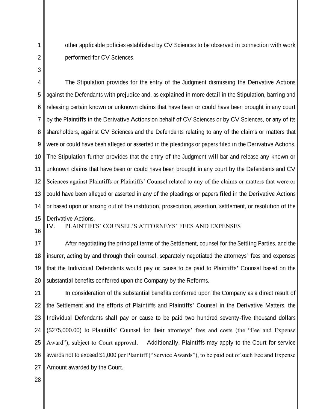 1 2 3 4 5 6 7 8 9 10 11 12 13 14 15 16 17 18 19 20 21 22 23 24 25 26 27 28 other applicable policies established by CV Sciences to be observed in connection with work performed for CV Sciences. The Stipulation provides for the entry of the Judgment dismissing the Derivative Actions against the Defendants with prejudice and, as explained in more detail in the Stipulation, barring and releasing certain known or unknown claims that have been or could have been brought in any court by the Plaintiffs in the Derivative Actions on behalf of CV Sciences or by CV Sciences, or any of its shareholders, against CV Sciences and the Defendants relating to any of the claims or matters that were or could have been alleged or asserted in the pleadings or papers filed in the Derivative Actions. The Stipulation further provides that the entry of the Judgment will bar and release any known or unknown claims that have been or could have been brought in any court by the Defendants and CV Sciences against Plaintiffs or Plaintiffs’ Counsel related to any of the claims or matters that were or could have been alleged or asserted in any of the pleadings or papers filed in the Derivative Actions or based upon or arising out of the institution, prosecution, assertion, settlement, or resolution of the Derivative Actions. IV. PLAINTIFFS’ COUNSEL’S ATTORNEYS’ FEES AND EXPENSES After negotiating the principal terms of the Settlement, counsel for the Settling Parties, and the insurer, acting by and through their counsel, separately negotiated the attorneys’ fees and expenses that the Individual Defendants would pay or cause to be paid to Plaintiffs’ Counsel based on the substantial benefits conferred upon the Company by the Reforms. In consideration of the substantial benefits conferred upon the Company as a direct result of the Settlement and the efforts of Plaintiffs and Plaintiffs’ Counsel in the Derivative Matters, the Individual Defendants shall pay or cause to be paid two hundred seventy-five thousand dollars ($275,000.00) to Plaintiffs’ Counsel for their attorneys’ fees and costs (the “Fee and Expense Award”), subject to Court approval. Additionally, Plaintiffs may apply to the Court for service awards not to exceed $1,000 per Plaintiff (“Service Awards”), to be paid out of such Fee and Expense Amount awarded by the Court.