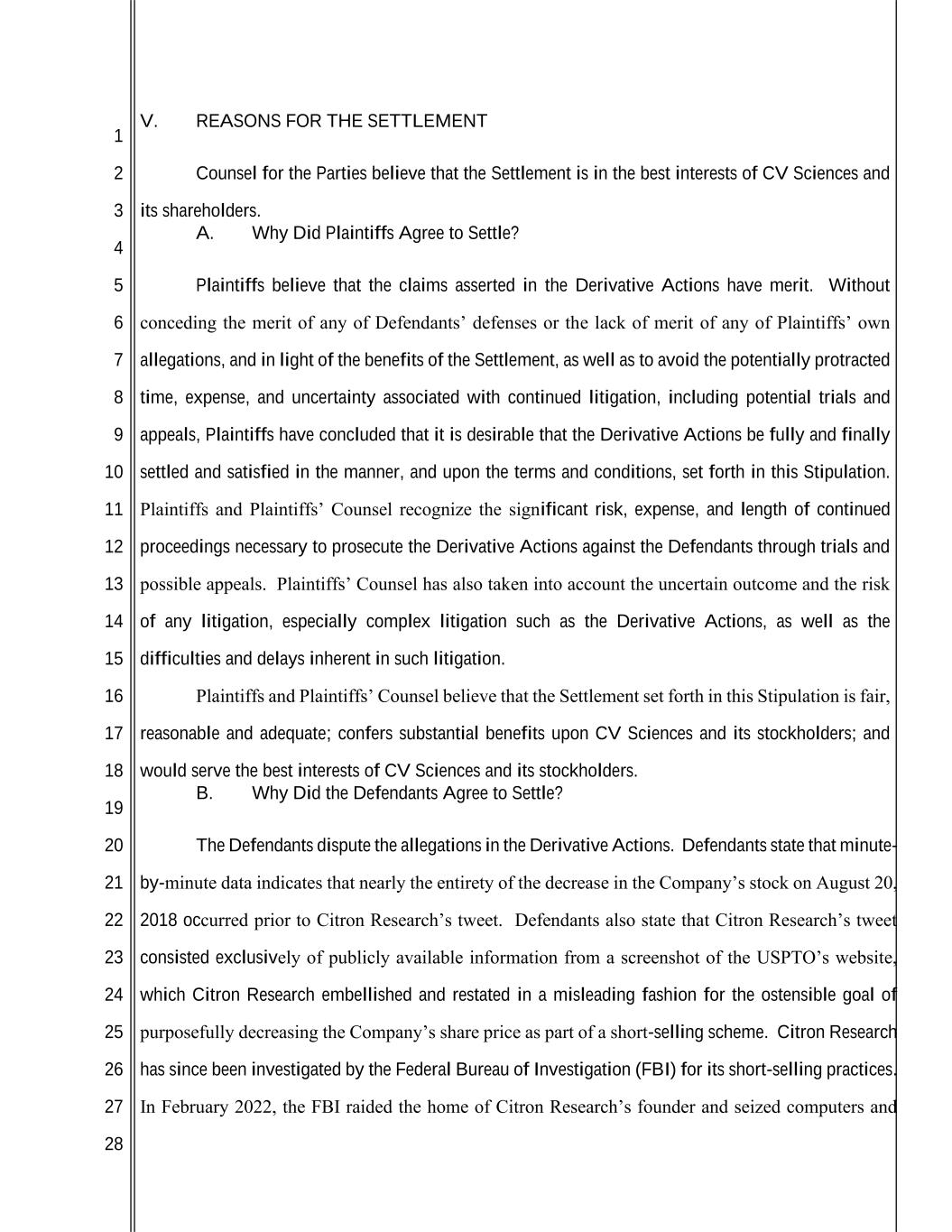 1 2 3 4 5 6 7 8 9 10 11 12 13 14 15 16 17 18 19 20 21 22 23 24 25 26 27 28 V. REASONS FOR THE SETTLEMENT Counsel for the Parties believe that the Settlement is in the best interests of CV Sciences and its shareholders. A. Why Did Plaintiffs Agree to Settle? Plaintiffs believe that the claims asserted in the Derivative Actions have merit. Without conceding the merit of any of Defendants’ defenses or the lack of merit of any of Plaintiffs’ own allegations, and in light of the benefits of the Settlement, as well as to avoid the potentially protracted time, expense, and uncertainty associated with continued litigation, including potential trials and appeals, Plaintiffs have concluded that it is desirable that the Derivative Actions be fully and finally settled and satisfied in the manner, and upon the terms and conditions, set forth in this Stipulation. Plaintiffs and Plaintiffs’ Counsel recognize the significant risk, expense, and length of continued proceedings necessary to prosecute the Derivative Actions against the Defendants through trials and possible appeals. Plaintiffs’ Counsel has also taken into account the uncertain outcome and the risk of any litigation, especially complex litigation such as the Derivative Actions, as well as the difficulties and delays inherent in such litigation. Plaintiffs and Plaintiffs’ Counsel believe that the Settlement set forth in this Stipulation is fair, reasonable and adequate; confers substantial benefits upon CV Sciences and its stockholders; and would serve the best interests of CV Sciences and its stockholders. B. Why Did the Defendants Agree to Settle? The Defendants dispute the allegations in the Derivative Actions. Defendants state that minute- by-minute data indicates that nearly the entirety of the decrease in the Company’s stock on August 20, 2018 occurred prior to Citron Research’s tweet. Defendants also state that Citron Research’s tweet consisted exclusively of publicly available information from a screenshot of the USPTO’s website, which Citron Research embellished and restated in a misleading fashion for the ostensible goal of purposefully decreasing the Company’s share price as part of a short-selling scheme. Citron Research has since been investigated by the Federal Bureau of Investigation (FBI) for its short-selling practices. In February 2022, the FBI raided the home of Citron Research’s founder and seized computers and