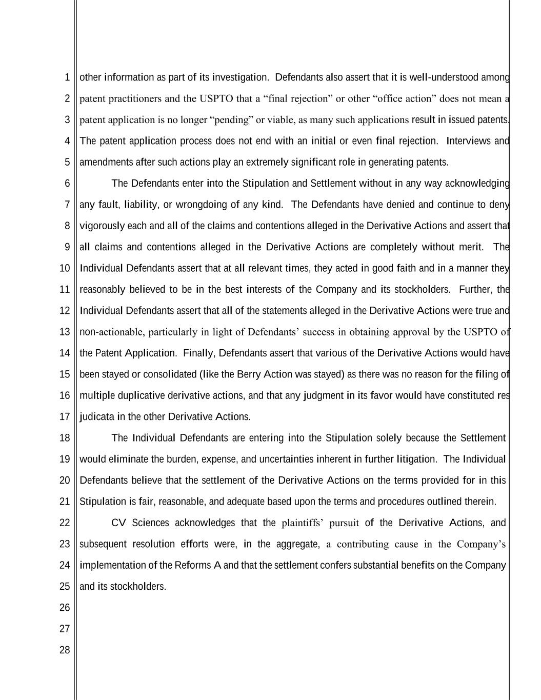 1 2 3 4 5 6 7 8 9 10 11 12 13 14 15 16 17 18 19 20 21 22 23 24 25 26 27 28 other information as part of its investigation. Defendants also assert that it is well-understood among patent practitioners and the USPTO that a “final rejection” or other “office action” does not mean a patent application is no longer “pending” or viable, as many such applications result in issued patents. The patent application process does not end with an initial or even final rejection. Interviews and amendments after such actions play an extremely significant role in generating patents. The Defendants enter into the Stipulation and Settlement without in any way acknowledging any fault, liability, or wrongdoing of any kind. The Defendants have denied and continue to deny vigorously each and all of the claims and contentions alleged in the Derivative Actions and assert that all claims and contentions alleged in the Derivative Actions are completely without merit. The Individual Defendants assert that at all relevant times, they acted in good faith and in a manner they reasonably believed to be in the best interests of the Company and its stockholders. Further, the Individual Defendants assert that all of the statements alleged in the Derivative Actions were true and non-actionable, particularly in light of Defendants’ success in obtaining approval by the USPTO of the Patent Application. Finally, Defendants assert that various of the Derivative Actions would have been stayed or consolidated (like the Berry Action was stayed) as there was no reason for the filing of multiple duplicative derivative actions, and that any judgment in its favor would have constituted res judicata in the other Derivative Actions. The Individual Defendants are entering into the Stipulation solely because the Settlement would eliminate the burden, expense, and uncertainties inherent in further litigation. The Individual Defendants believe that the settlement of the Derivative Actions on the terms provided for in this Stipulation is fair, reasonable, and adequate based upon the terms and procedures outlined therein. CV Sciences acknowledges that the plaintiffs’ pursuit of the Derivative Actions, and subsequent resolution efforts were, in the aggregate, a contributing cause in the Company’s implementation of the Reforms A and that the settlement confers substantial benefits on the Company and its stockholders.