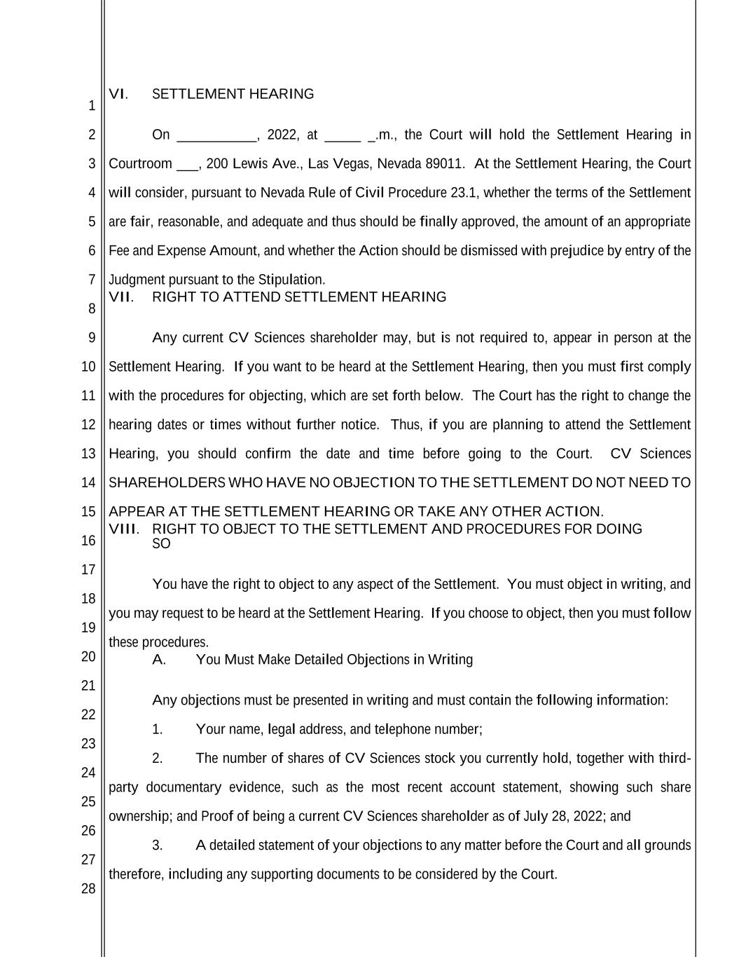 1 2 3 4 5 6 7 8 9 10 11 12 13 14 15 16 17 18 19 20 21 22 23 24 25 26 27 28 VI. SETTLEMENT HEARING On ___________, 2022, at _____ _.m., the Court will hold the Settlement Hearing in Courtroom ___, 200 Lewis Ave., Las Vegas, Nevada 89011. At the Settlement Hearing, the Court will consider, pursuant to Nevada Rule of Civil Procedure 23.1, whether the terms of the Settlement are fair, reasonable, and adequate and thus should be finally approved, the amount of an appropriate Fee and Expense Amount, and whether the Action should be dismissed with prejudice by entry of the Judgment pursuant to the Stipulation. VII. RIGHT TO ATTEND SETTLEMENT HEARING Any current CV Sciences shareholder may, but is not required to, appear in person at the Settlement Hearing. If you want to be heard at the Settlement Hearing, then you must first comply with the procedures for objecting, which are set forth below. The Court has the right to change the hearing dates or times without further notice. Thus, if you are planning to attend the Settlement Hearing, you should confirm the date and time before going to the Court. CV Sciences SHAREHOLDERS WHO HAVE NO OBJECTION TO THE SETTLEMENT DO NOT NEED TO APPEAR AT THE SETTLEMENT HEARING OR TAKE ANY OTHER ACTION. VIII. RIGHT TO OBJECT TO THE SETTLEMENT AND PROCEDURES FOR DOING SO You have the right to object to any aspect of the Settlement. You must object in writing, and you may request to be heard at the Settlement Hearing. If you choose to object, then you must follow these procedures. A. You Must Make Detailed Objections in Writing Any objections must be presented in writing and must contain the following information: 1. Your name, legal address, and telephone number; 2. The number of shares of CV Sciences stock you currently hold, together with third- party documentary evidence, such as the most recent account statement, showing such share ownership; and Proof of being a current CV Sciences shareholder as of July 28, 2022; and 3. A detailed statement of your objections to any matter before the Court and all grounds therefore, including any supporting documents to be considered by the Court.