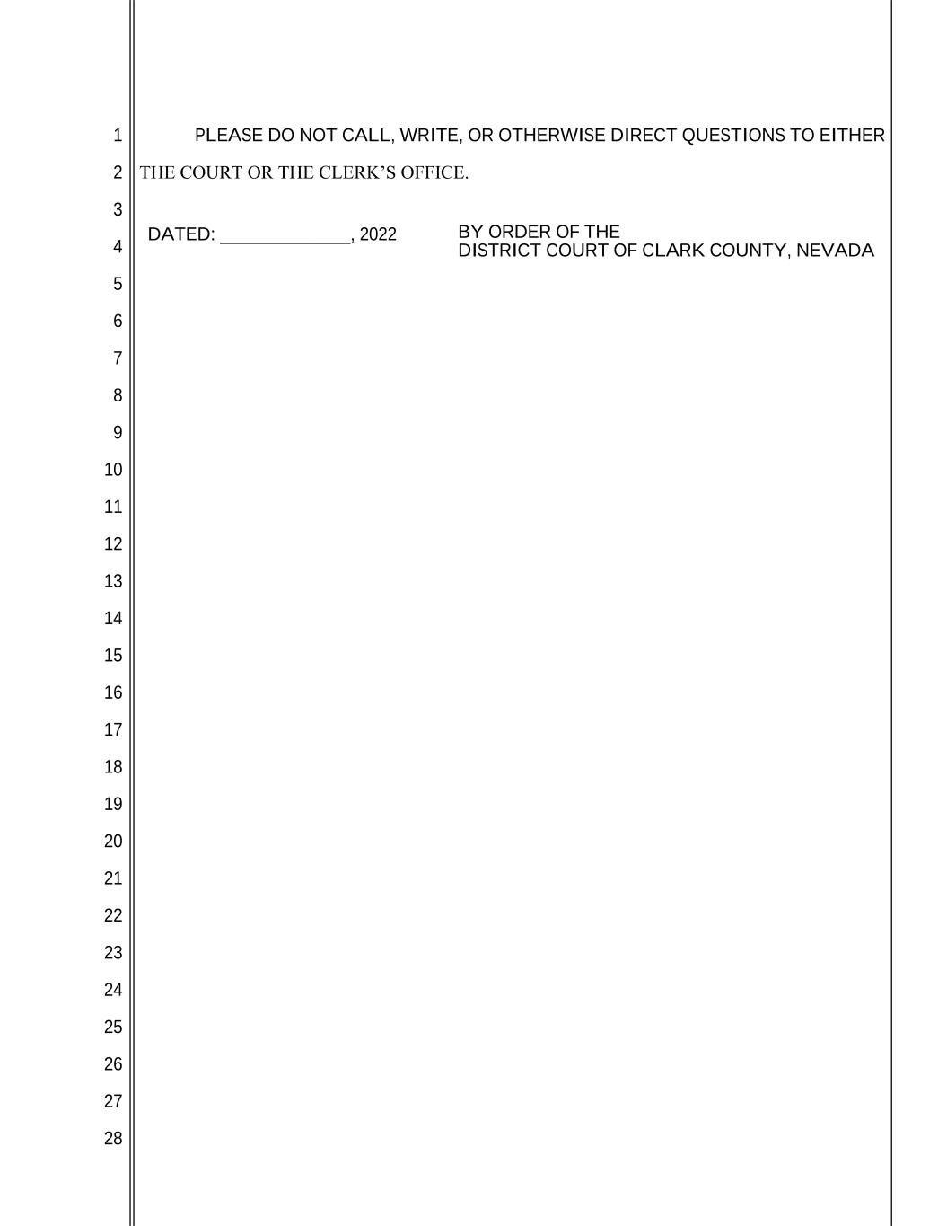 1 2 3 4 5 6 7 8 9 10 11 12 13 14 15 16 17 18 19 20 21 22 23 24 25 26 27 28 PLEASE DO NOT CALL, WRITE, OR OTHERWISE DIRECT QUESTIONS TO EITHER THE COURT OR THE CLERK’S OFFICE. DATED: ______________, 2022 BY ORDER OF THE DISTRICT COURT OF CLARK COUNTY, NEVADA