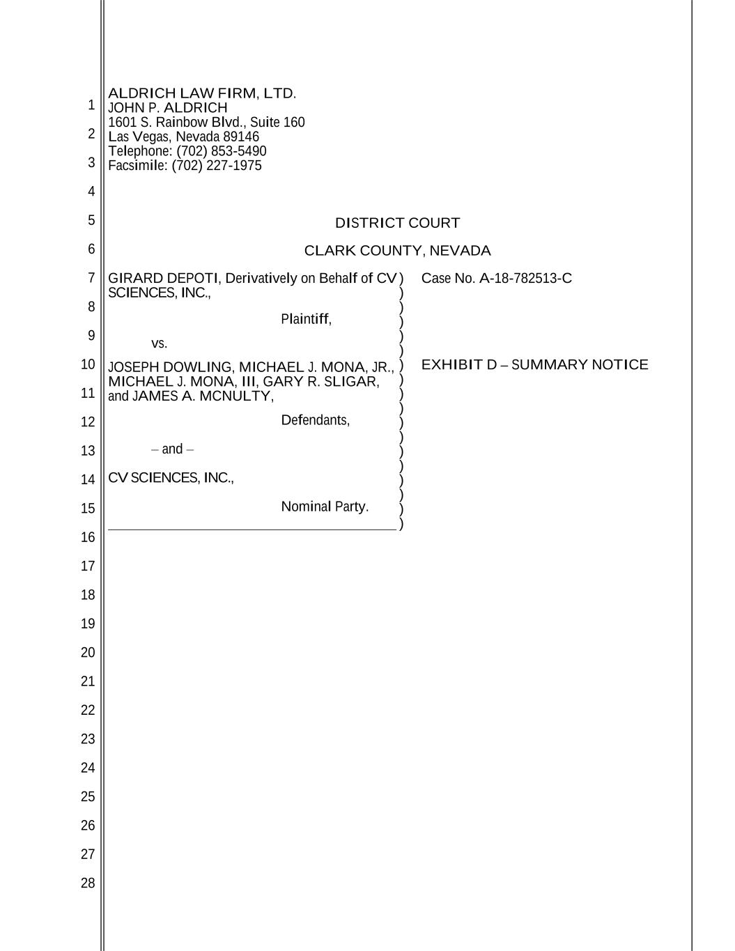 1 2 3 4 5 6 7 8 9 10 11 12 13 14 15 16 17 18 19 20 21 22 23 24 25 26 27 28 ALDRICH LAW FIRM, LTD. JOHN P. ALDRICH 1601 S. Rainbow Blvd., Suite 160 Las Vegas, Nevada 89146 Telephone: (702) 853-5490 Facsimile: (702) 227-1975 DISTRICT COURT CLARK COUNTY, NEVADA GIRARD DEPOTI, Derivatively on Behalf of CV SCIENCES, INC., Plaintiff, vs. JOSEPH DOWLING, MICHAEL J. MONA, JR., MICHAEL J. MONA, III, GARY R. SLIGAR, and JAMES A. MCNULTY, Defendants, – and – CV SCIENCES, INC., Nominal Party. ) ) ) ) ) ) ) ) ) ) ) ) ) ) ) ) ) ) Case No. A-18-782513-C EXHIBIT D – SUMMARY NOTICE