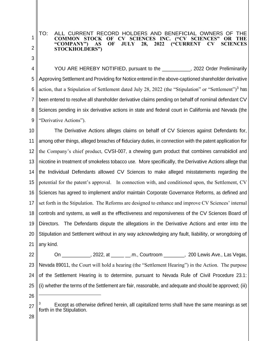 1 2 3 4 5 6 7 8 9 10 11 12 13 14 15 16 17 18 19 20 21 22 23 24 25 26 27 28 TO: ALL CURRENT RECORD HOLDERS AND BENEFICIAL OWNERS OF THE COMMON STOCK OF CV SCIENCES INC. (“CV SCIENCES” OR THE “COMPANY”) AS OF JULY 28, 2022 (“CURRENT CV SCIENCES STOCKHOLDERS”) YOU ARE HEREBY NOTIFIED, pursuant to the ___________, 2022 Order Preliminarily Approving Settlement and Providing for Notice entered in the above-captioned shareholder derivative action, that a Stipulation of Settlement dated July 28, 2022 (the “Stipulation” or “Settlement”)3 has been entered to resolve all shareholder derivative claims pending on behalf of nominal defendant CV Sciences pending in six derivative actions in state and federal court in California and Nevada (the “Derivative Actions”). The Derivative Actions alleges claims on behalf of CV Sciences against Defendants for, among other things, alleged breaches of fiduciary duties, in connection with the patent application for the Company’s chief product, CVSI-007, a chewing gum product that combines cannabidiol and nicotine in treatment of smokeless tobacco use. More specifically, the Derivative Actions allege that the Individual Defendants allowed CV Sciences to make alleged misstatements regarding the potential for the patent’s approval. In connection with, and conditioned upon, the Settlement, CV Sciences has agreed to implement and/or maintain Corporate Governance Reforms, as defined and set forth in the Stipulation. The Reforms are designed to enhance and improve CV Sciences’ internal controls and systems, as well as the effectiveness and responsiveness of the CV Sciences Board of Directors. The Defendants dispute the allegations in the Derivative Actions and enter into the Stipulation and Settlement without in any way acknowledging any fault, liability, or wrongdoing of any kind. On ___________, 2022, at _____ __.m., Courtroom ________, 200 Lewis Ave., Las Vegas, Nevada 89011, the Court will hold a hearing (the “Settlement Hearing”) in the Action. The purpose of the Settlement Hearing is to determine, pursuant to Nevada Rule of Civil Procedure 23.1: (i) whether the terms of the Settlement are fair, reasonable, and adequate and should be approved; (ii) 3 Except as otherwise defined herein, all capitalized terms shall have the same meanings as set forth in the Stipulation.