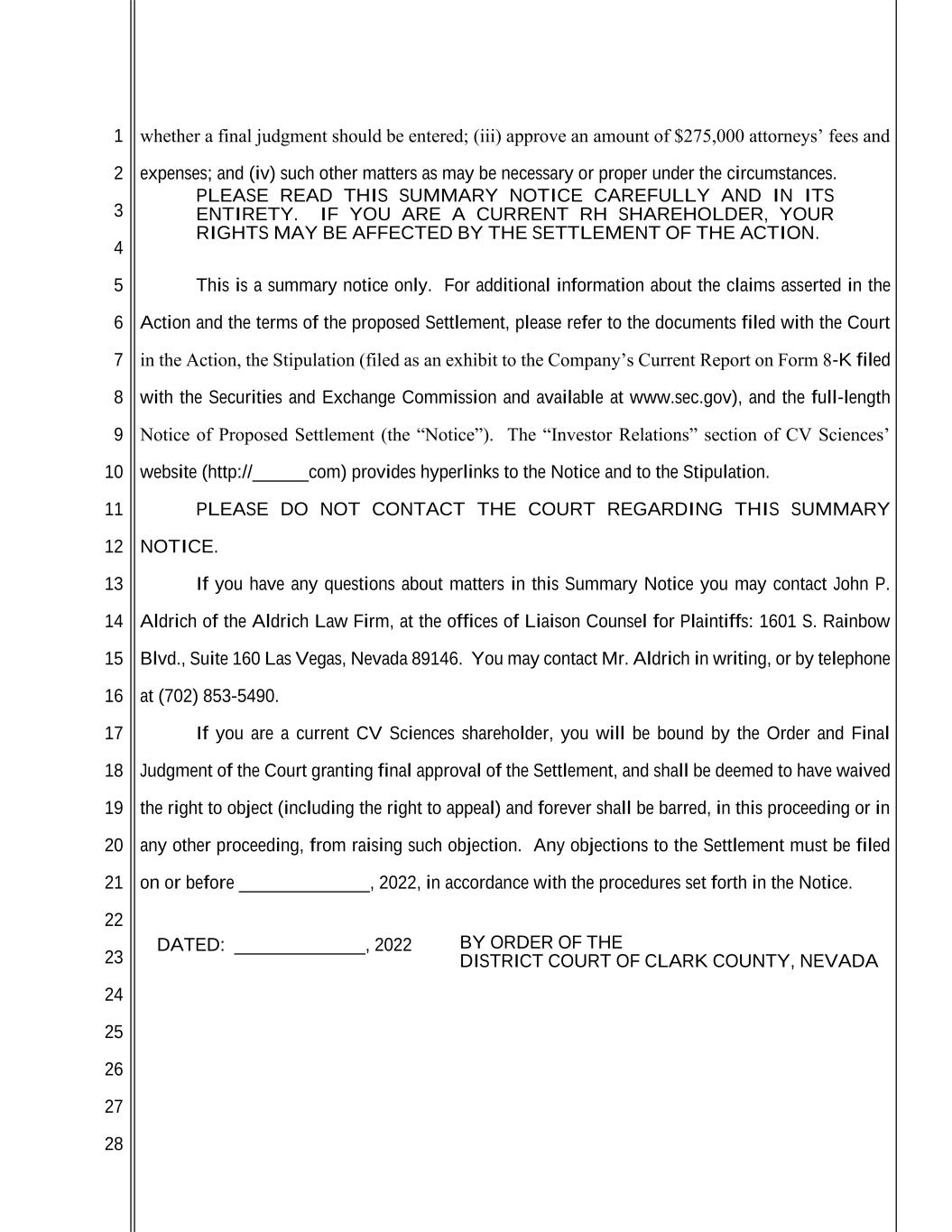1 2 3 4 5 6 7 8 9 10 11 12 13 14 15 16 17 18 19 20 21 22 23 24 25 26 27 28 whether a final judgment should be entered; (iii) approve an amount of $275,000 attorneys’ fees and expenses; and (iv) such other matters as may be necessary or proper under the circumstances. PLEASE READ THIS SUMMARY NOTICE CAREFULLY AND IN ITS ENTIRETY. IF YOU ARE A CURRENT RH SHAREHOLDER, YOUR RIGHTS MAY BE AFFECTED BY THE SETTLEMENT OF THE ACTION. This is a summary notice only. For additional information about the claims asserted in the Action and the terms of the proposed Settlement, please refer to the documents filed with the Court in the Action, the Stipulation (filed as an exhibit to the Company’s Current Report on Form 8-K filed with the Securities and Exchange Commission and available at www.sec.gov), and the full-length Notice of Proposed Settlement (the “Notice”). The “Investor Relations” section of CV Sciences’ website (http://______com) provides hyperlinks to the Notice and to the Stipulation. PLEASE DO NOT CONTACT THE COURT REGARDING THIS SUMMARY NOTICE. If you have any questions about matters in this Summary Notice you may contact John P. Aldrich of the Aldrich Law Firm, at the offices of Liaison Counsel for Plaintiffs: 1601 S. Rainbow Blvd., Suite 160 Las Vegas, Nevada 89146. You may contact Mr. Aldrich in writing, or by telephone at (702) 853-5490. If you are a current CV Sciences shareholder, you will be bound by the Order and Final Judgment of the Court granting final approval of the Settlement, and shall be deemed to have waived the right to object (including the right to appeal) and forever shall be barred, in this proceeding or in any other proceeding, from raising such objection. Any objections to the Settlement must be filed on or before ______________, 2022, in accordance with the procedures set forth in the Notice. DATED: ______________, 2022 BY ORDER OF THE DISTRICT COURT OF CLARK COUNTY, NEVADA