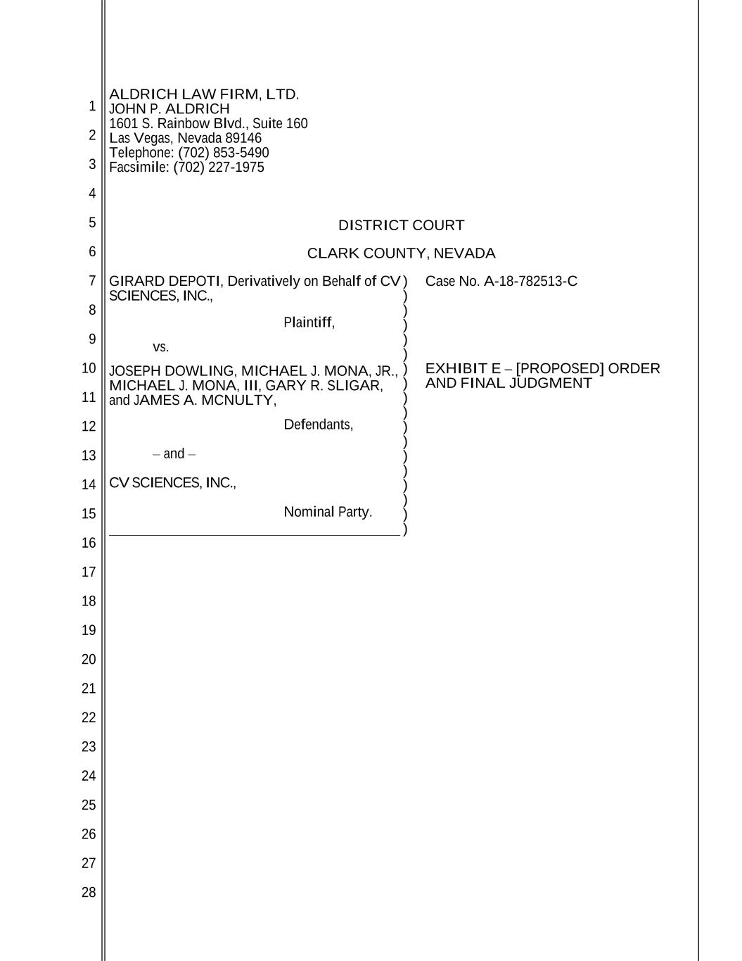 1 2 3 4 5 6 7 8 9 10 11 12 13 14 15 16 17 18 19 20 21 22 23 24 25 26 27 28 ALDRICH LAW FIRM, LTD. JOHN P. ALDRICH 1601 S. Rainbow Blvd., Suite 160 Las Vegas, Nevada 89146 Telephone: (702) 853-5490 Facsimile: (702) 227-1975 DISTRICT COURT CLARK COUNTY, NEVADA GIRARD DEPOTI, Derivatively on Behalf of CV SCIENCES, INC., Plaintiff, vs. JOSEPH DOWLING, MICHAEL J. MONA, JR., MICHAEL J. MONA, III, GARY R. SLIGAR, and JAMES A. MCNULTY, Defendants, – and – CV SCIENCES, INC., Nominal Party. ) ) ) ) ) ) ) ) ) ) ) ) ) ) ) ) ) ) Case No. A-18-782513-C EXHIBIT E – [PROPOSED] ORDER AND FINAL JUDGMENT