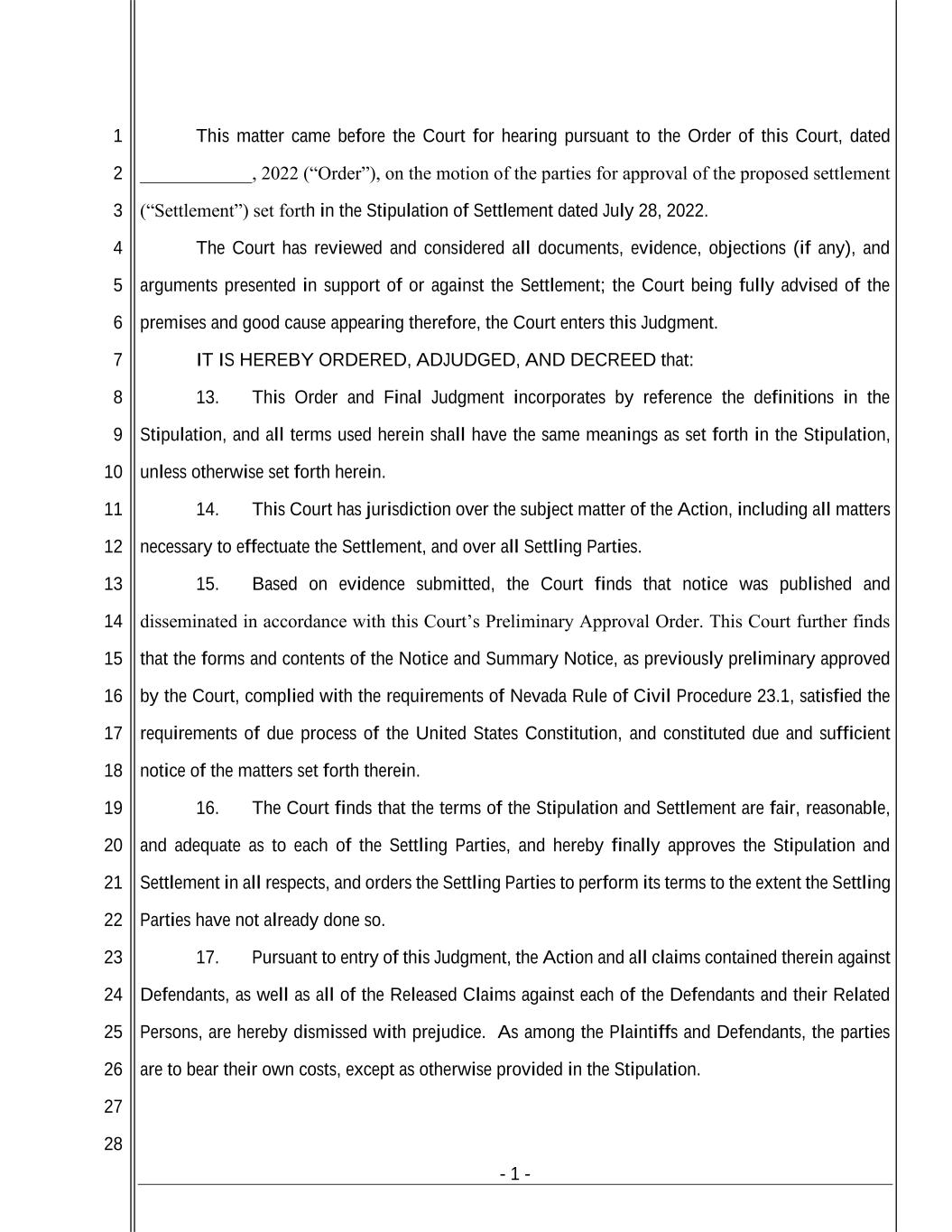 - 1 - 1 2 3 4 5 6 7 8 9 10 11 12 13 14 15 16 17 18 19 20 21 22 23 24 25 26 27 28 This matter came before the Court for hearing pursuant to the Order of this Court, dated ____________, 2022 (“Order”), on the motion of the parties for approval of the proposed settlement (“Settlement”) set forth in the Stipulation of Settlement dated July 28, 2022. The Court has reviewed and considered all documents, evidence, objections (if any), and arguments presented in support of or against the Settlement; the Court being fully advised of the premises and good cause appearing therefore, the Court enters this Judgment. IT IS HEREBY ORDERED, ADJUDGED, AND DECREED that: 13. This Order and Final Judgment incorporates by reference the definitions in the Stipulation, and all terms used herein shall have the same meanings as set forth in the Stipulation, unless otherwise set forth herein. 14. This Court has jurisdiction over the subject matter of the Action, including all matters necessary to effectuate the Settlement, and over all Settling Parties. 15. Based on evidence submitted, the Court finds that notice was published and disseminated in accordance with this Court’s Preliminary Approval Order. This Court further finds that the forms and contents of the Notice and Summary Notice, as previously preliminary approved by the Court, complied with the requirements of Nevada Rule of Civil Procedure 23.1, satisfied the requirements of due process of the United States Constitution, and constituted due and sufficient notice of the matters set forth therein. 16. The Court finds that the terms of the Stipulation and Settlement are fair, reasonable, and adequate as to each of the Settling Parties, and hereby finally approves the Stipulation and Settlement in all respects, and orders the Settling Parties to perform its terms to the extent the Settling Parties have not already done so. 17. Pursuant to entry of this Judgment, the Action and all claims contained therein against Defendants, as well as all of the Released Claims against each of the Defendants and their Related Persons, are hereby dismissed with prejudice. As among the Plaintiffs and Defendants, the parties are to bear their own costs, except as otherwise provided in the Stipulation.