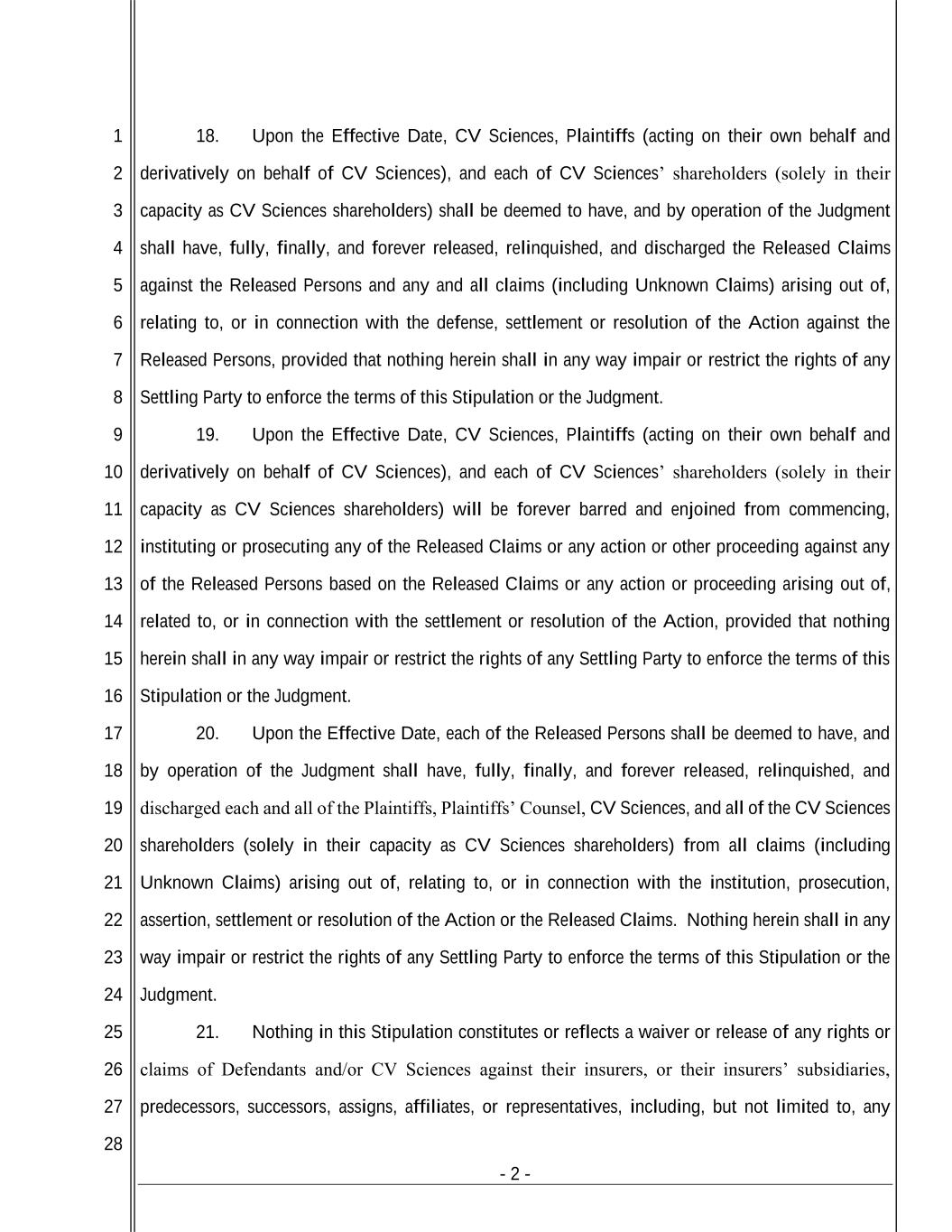 - 2 - 1 2 3 4 5 6 7 8 9 10 11 12 13 14 15 16 17 18 19 20 21 22 23 24 25 26 27 28 18. Upon the Effective Date, CV Sciences, Plaintiffs (acting on their own behalf and derivatively on behalf of CV Sciences), and each of CV Sciences’ shareholders (solely in their capacity as CV Sciences shareholders) shall be deemed to have, and by operation of the Judgment shall have, fully, finally, and forever released, relinquished, and discharged the Released Claims against the Released Persons and any and all claims (including Unknown Claims) arising out of, relating to, or in connection with the defense, settlement or resolution of the Action against the Released Persons, provided that nothing herein shall in any way impair or restrict the rights of any Settling Party to enforce the terms of this Stipulation or the Judgment. 19. Upon the Effective Date, CV Sciences, Plaintiffs (acting on their own behalf and derivatively on behalf of CV Sciences), and each of CV Sciences’ shareholders (solely in their capacity as CV Sciences shareholders) will be forever barred and enjoined from commencing, instituting or prosecuting any of the Released Claims or any action or other proceeding against any of the Released Persons based on the Released Claims or any action or proceeding arising out of, related to, or in connection with the settlement or resolution of the Action, provided that nothing herein shall in any way impair or restrict the rights of any Settling Party to enforce the terms of this Stipulation or the Judgment. 20. Upon the Effective Date, each of the Released Persons shall be deemed to have, and by operation of the Judgment shall have, fully, finally, and forever released, relinquished, and discharged each and all of the Plaintiffs, Plaintiffs’ Counsel, CV Sciences, and all of the CV Sciences shareholders (solely in their capacity as CV Sciences shareholders) from all claims (including Unknown Claims) arising out of, relating to, or in connection with the institution, prosecution, assertion, settlement or resolution of the Action or the Released Claims. Nothing herein shall in any way impair or restrict the rights of any Settling Party to enforce the terms of this Stipulation or the Judgment. 21. Nothing in this Stipulation constitutes or reflects a waiver or release of any rights or claims of Defendants and/or CV Sciences against their insurers, or their insurers’ subsidiaries, predecessors, successors, assigns, affiliates, or representatives, including, but not limited to, any