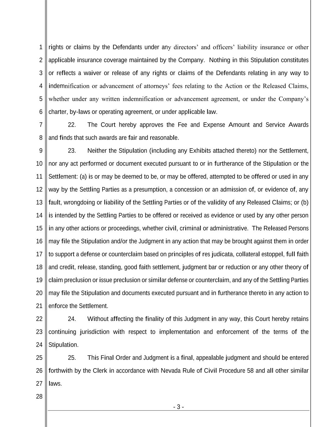- 3 - 1 2 3 4 5 6 7 8 9 10 11 12 13 14 15 16 17 18 19 20 21 22 23 24 25 26 27 28 rights or claims by the Defendants under any directors’ and officers’ liability insurance or other applicable insurance coverage maintained by the Company. Nothing in this Stipulation constitutes or reflects a waiver or release of any rights or claims of the Defendants relating in any way to indemnification or advancement of attorneys’ fees relating to the Action or the Released Claims, whether under any written indemnification or advancement agreement, or under the Company’s charter, by-laws or operating agreement, or under applicable law. 22. The Court hereby approves the Fee and Expense Amount and Service Awards and finds that such awards are fair and reasonable. 23. Neither the Stipulation (including any Exhibits attached thereto) nor the Settlement, nor any act performed or document executed pursuant to or in furtherance of the Stipulation or the Settlement: (a) is or may be deemed to be, or may be offered, attempted to be offered or used in any way by the Settling Parties as a presumption, a concession or an admission of, or evidence of, any fault, wrongdoing or liability of the Settling Parties or of the validity of any Released Claims; or (b) is intended by the Settling Parties to be offered or received as evidence or used by any other person in any other actions or proceedings, whether civil, criminal or administrative. The Released Persons may file the Stipulation and/or the Judgment in any action that may be brought against them in order to support a defense or counterclaim based on principles of res judicata, collateral estoppel, full faith and credit, release, standing, good faith settlement, judgment bar or reduction or any other theory of claim preclusion or issue preclusion or similar defense or counterclaim, and any of the Settling Parties may file the Stipulation and documents executed pursuant and in furtherance thereto in any action to enforce the Settlement. 24. Without affecting the finality of this Judgment in any way, this Court hereby retains continuing jurisdiction with respect to implementation and enforcement of the terms of the Stipulation. 25. This Final Order and Judgment is a final, appealable judgment and should be entered forthwith by the Clerk in accordance with Nevada Rule of Civil Procedure 58 and all other similar laws.