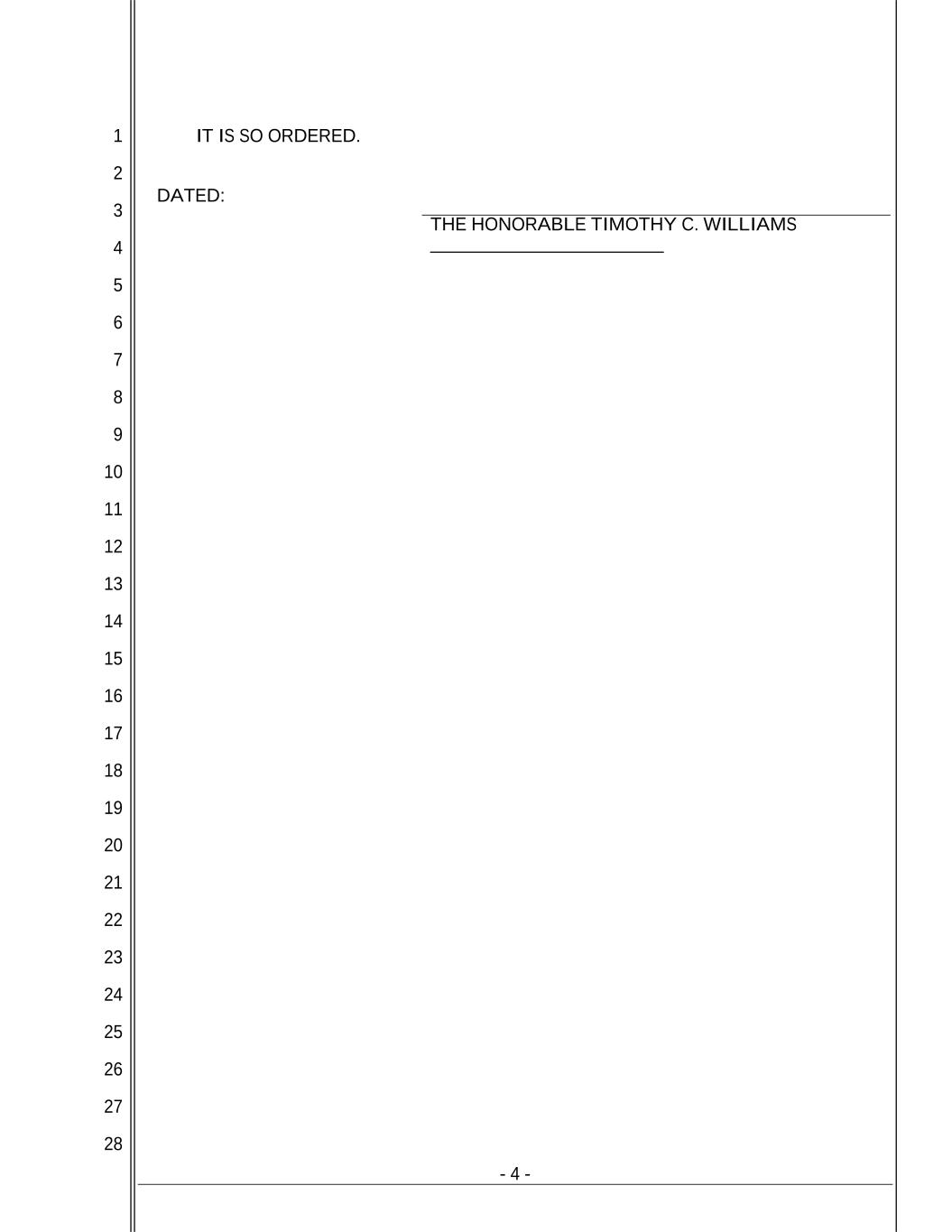 - 4 - 1 2 3 4 5 6 7 8 9 10 11 12 13 14 15 16 17 18 19 20 21 22 23 24 25 26 27 28 IT IS SO ORDERED. DATED: THE HONORABLE TIMOTHY C. WILLIAMS _________________________