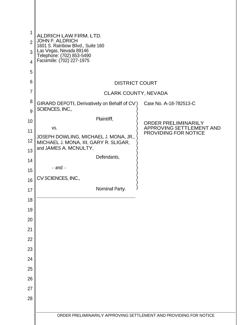 ORDER PRELIMINARILY APPROVING SETTLEMENT AND PROVIDING FOR NOTICE 1 2 3 4 5 6 7 8 9 10 11 12 13 14 15 16 17 18 19 20 21 22 23 24 25 26 27 28 ALDRICH LAW FIRM, LTD. JOHN P. ALDRICH 1601 S. Rainbow Blvd., Suite 160 Las Vegas, Nevada 89146 Telephone: (702) 853-5490 Facsimile: (702) 227-1975 DISTRICT COURT CLARK COUNTY, NEVADA GIRARD DEPOTI, Derivatively on Behalf of CV SCIENCES, INC., Plaintiff, vs. JOSEPH DOWLING, MICHAEL J. MONA, JR., MICHAEL J. MONA, III, GARY R. SLIGAR, and JAMES A. MCNULTY, Defendants, – and – CV SCIENCES, INC., Nominal Party. ) ) ) ) ) ) ) ) ) ) ) ) ) ) ) ) ) ) Case No. A-18-782513-C ORDER PRELIMINARILY APPROVING SETTLEMENT AND PROVIDING FOR NOTICE