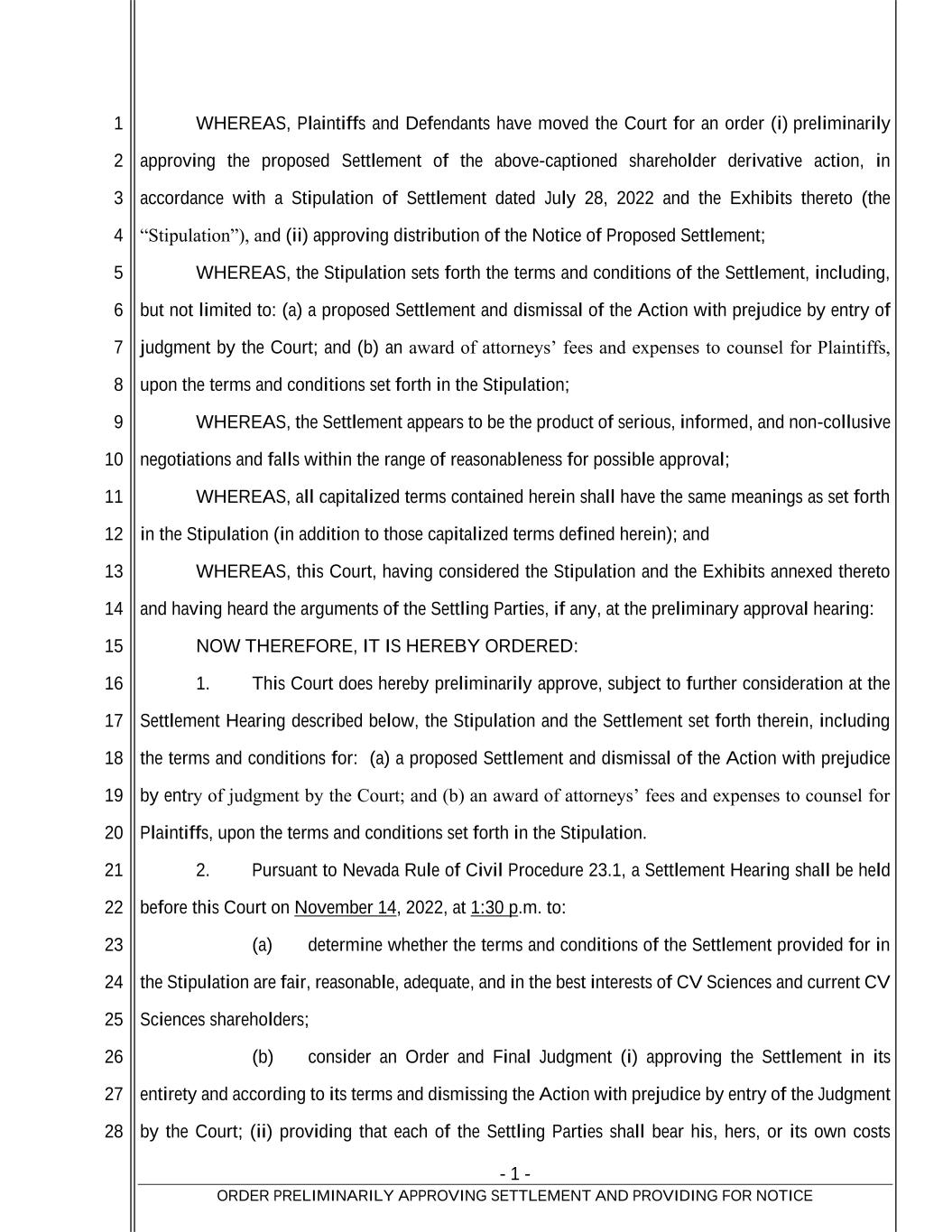 - 1 - ORDER PRELIMINARILY APPROVING SETTLEMENT AND PROVIDING FOR NOTICE 1 2 3 4 5 6 7 8 9 10 11 12 13 14 15 16 17 18 19 20 21 22 23 24 25 26 27 28 WHEREAS, Plaintiffs and Defendants have moved the Court for an order (i) preliminarily approving the proposed Settlement of the above-captioned shareholder derivative action, in accordance with a Stipulation of Settlement dated July 28, 2022 and the Exhibits thereto (the “Stipulation”), and (ii) approving distribution of the Notice of Proposed Settlement; WHEREAS, the Stipulation sets forth the terms and conditions of the Settlement, including, but not limited to: (a) a proposed Settlement and dismissal of the Action with prejudice by entry of judgment by the Court; and (b) an award of attorneys’ fees and expenses to counsel for Plaintiffs, upon the terms and conditions set forth in the Stipulation; WHEREAS, the Settlement appears to be the product of serious, informed, and non-collusive negotiations and falls within the range of reasonableness for possible approval; WHEREAS, all capitalized terms contained herein shall have the same meanings as set forth in the Stipulation (in addition to those capitalized terms defined herein); and WHEREAS, this Court, having considered the Stipulation and the Exhibits annexed thereto and having heard the arguments of the Settling Parties, if any, at the preliminary approval hearing: NOW THEREFORE, IT IS HEREBY ORDERED: 1. This Court does hereby preliminarily approve, subject to further consideration at the Settlement Hearing described below, the Stipulation and the Settlement set forth therein, including the terms and conditions for: (a) a proposed Settlement and dismissal of the Action with prejudice by entry of judgment by the Court; and (b) an award of attorneys’ fees and expenses to counsel for Plaintiffs, upon the terms and conditions set forth in the Stipulation. 2. Pursuant to Nevada Rule of Civil Procedure 23.1, a Settlement Hearing shall be held before this Court on November 14, 2022, at 1:30 p.m. to: (a) determine whether the terms and conditions of the Settlement provided for in the Stipulation are fair, reasonable, adequate, and in the best interests of CV Sciences and current CV Sciences shareholders; (b) consider an Order and Final Judgment (i) approving the Settlement in its entirety and according to its terms and dismissing the Action with prejudice by entry of the Judgment by the Court; (ii) providing that each of the Settling Parties shall bear his, hers, or its own costs