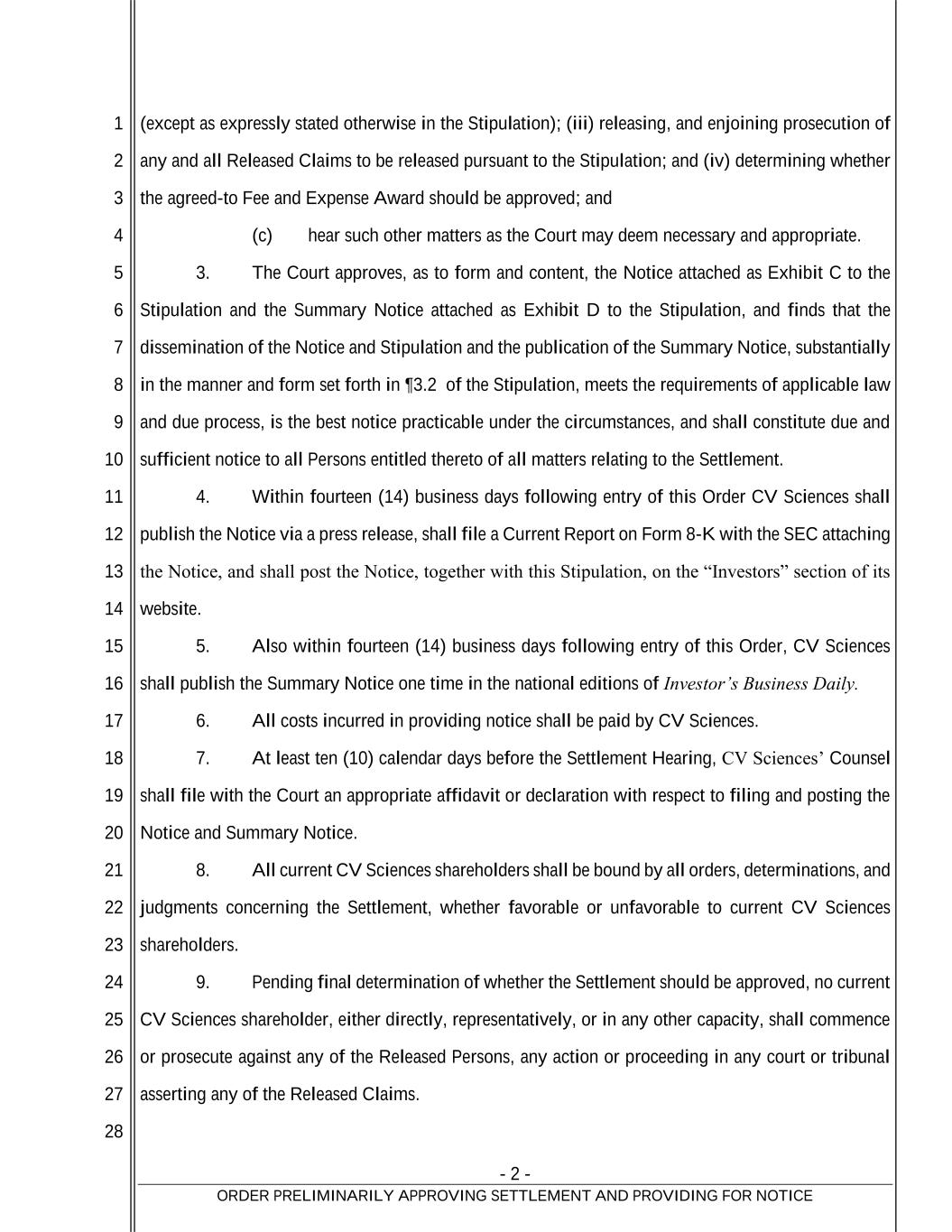 - 2 - ORDER PRELIMINARILY APPROVING SETTLEMENT AND PROVIDING FOR NOTICE 1 2 3 4 5 6 7 8 9 10 11 12 13 14 15 16 17 18 19 20 21 22 23 24 25 26 27 28 (except as expressly stated otherwise in the Stipulation); (iii) releasing, and enjoining prosecution of any and all Released Claims to be released pursuant to the Stipulation; and (iv) determining whether the agreed-to Fee and Expense Award should be approved; and (c) hear such other matters as the Court may deem necessary and appropriate. 3. The Court approves, as to form and content, the Notice attached as Exhibit C to the Stipulation and the Summary Notice attached as Exhibit D to the Stipulation, and finds that the dissemination of the Notice and Stipulation and the publication of the Summary Notice, substantially in the manner and form set forth in ¶3.2 of the Stipulation, meets the requirements of applicable law and due process, is the best notice practicable under the circumstances, and shall constitute due and sufficient notice to all Persons entitled thereto of all matters relating to the Settlement. 4. Within fourteen (14) business days following entry of this Order CV Sciences shall publish the Notice via a press release, shall file a Current Report on Form 8-K with the SEC attaching the Notice, and shall post the Notice, together with this Stipulation, on the “Investors” section of its website. 5. Also within fourteen (14) business days following entry of this Order, CV Sciences shall publish the Summary Notice one time in the national editions of Investor’s Business Daily. 6. All costs incurred in providing notice shall be paid by CV Sciences. 7. At least ten (10) calendar days before the Settlement Hearing, CV Sciences’ Counsel shall file with the Court an appropriate affidavit or declaration with respect to filing and posting the Notice and Summary Notice. 8. All current CV Sciences shareholders shall be bound by all orders, determinations, and judgments concerning the Settlement, whether favorable or unfavorable to current CV Sciences shareholders. 9. Pending final determination of whether the Settlement should be approved, no current CV Sciences shareholder, either directly, representatively, or in any other capacity, shall commence or prosecute against any of the Released Persons, any action or proceeding in any court or tribunal asserting any of the Released Claims.
